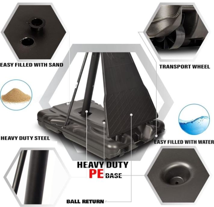 Pokretni koš za košarku s tablom od polikarbonata visoke otpornosti na udarce. Koš je namijenjen zahtjevnijim kućnim korisnicima. Precizna izrada, elegantan dizajn i izdržljivost učinit će da se svaki ljubitelj košarke osjeća kao profesionalni igrač. Visina se po potrebi može podesiti do 305 cm. Tabla koša izrađena je od vrlo izdržljivog PVC materijala. U kombinaciji s čeličnim obručem osigurava dugotrajnu upotrebu. Donji nosač se može napuniti pijeskom ili vodom (preporučuje se pijesak).Visina obruča: 2,24 - 3,05 m (službena visina)Uz koš dolazi čvrsti obruč s oprugama koje omogućuju zakucavanje lopte.Podešavanje visine: glatkoGlavna cijev za pričvršćivanje: 10 x 10 cmPromjer obruča: 45 cmMaterijal obruča: čelikMaterijal mrežice: najlonMaterijal table: PCVeličina table: 140 x 82 cmDimenzije baze: 132,5 x 80,5 cmZapremina vode/pijeska: 150 lTežina: 66 kg (najveći model)Vješanje na obruč je zabranjenoVeč podatkov o izdelku si oglejte na tej povezavi