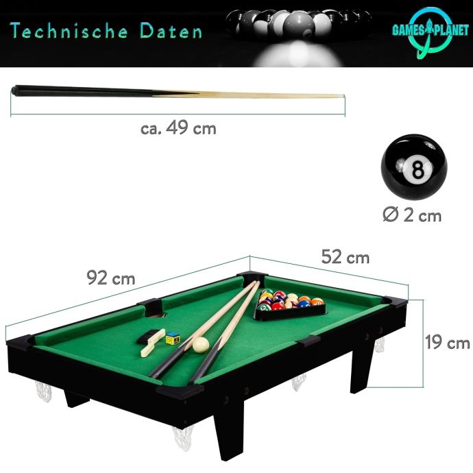 Dimenzije stola za bilijar: cca 92 cm (D) x 52 cm (Š) x 19 cm (V), težina: cca 8 kg, materijal tijela: MDF