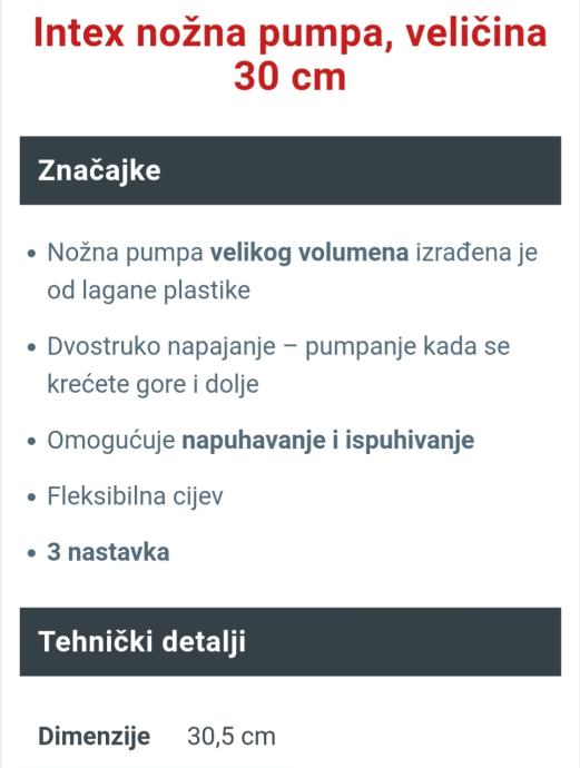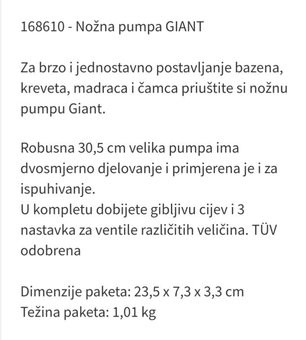 Prodajem veliku i jaku nožnu zračnu pumpu "GIANT QUICKFILL" 168610, renomirane tvrtke "INTEX" .