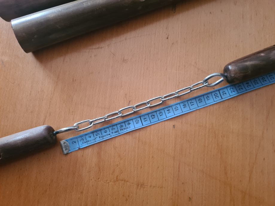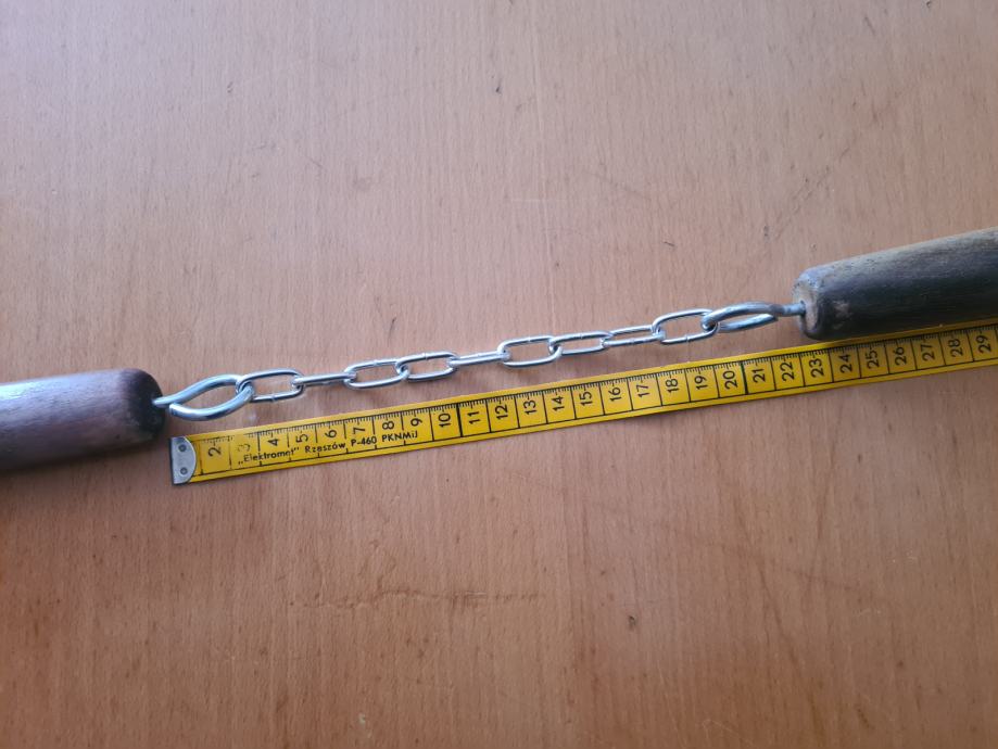 Original mjere: 35 cm dužina, konus mjera 38 / s deblje strane/x 22 / s tanje strane do lanca/ mm. Dužina lanca 21 cm s spojnicama; no- može se podesiti na kraće, a i na duže!