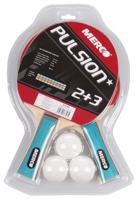 Set za stolni tenis Merco Pulsion* sastoji se od dva reketa za stolni tenis Pulsion* i tri loptice za stolni tenis Popular. Reketi su izrađeni od 5-slojnog drva, PU pjene i gume. Parametri: brzina 7/10, kontrola 9/10, rotacija 6/10. Reket ima drvenu konkavnu ručku koja osigurava dobar zahvat. Popular loptice promjera su 40 mm, bijele boje bez loga. Dimenzije pakiranja su 31 x 20 x 5 cm, a težina je 370 g.