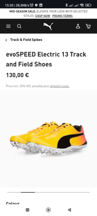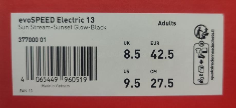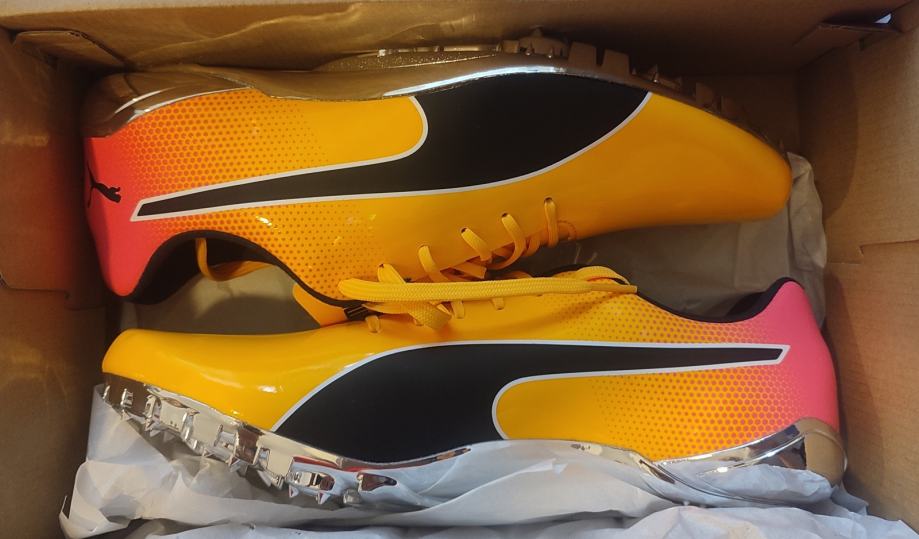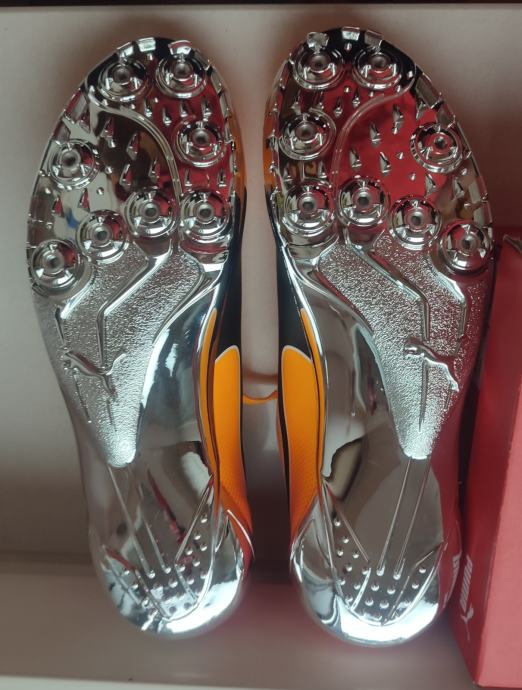 Potpuno nove Puma atletske sprinterice. Atraktivna narančasto-crna kombinacija boja. Uz sprinte dolaze šiljci i vrećica. Dolaze u originalnoj Puma kutiji, nekorištene i spremne za vrhunske sportske rezultate. Kupljena kriva veličina. Doslovno izvađene iz kutije, probane i nažalost vraćene u kutiju.