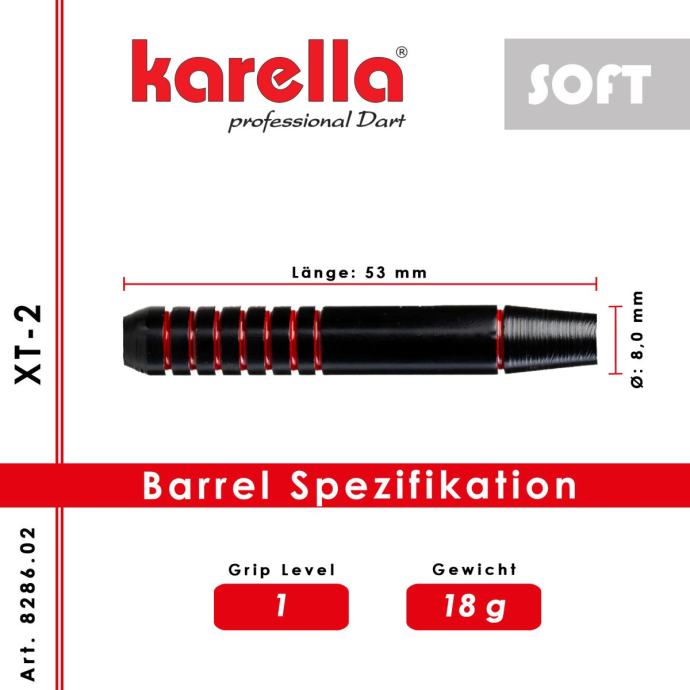 Crno presvučena, ravna cijev XT-2 strelica ukrašena je klasičnim Karella bojama s crvenim utorima za rukohvat. Savršeno uravnotežena strelica savršeno leži u ruci i impresionira svojim prvoklasnim letnim karakteristikama.