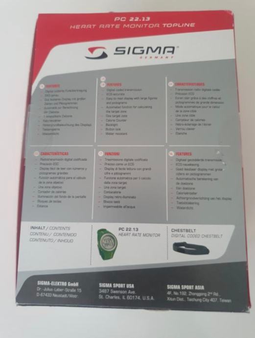 Sportski sat SIGMA PC 22.13 Man moderan je monitor otkucaja srca SIGMA-e, svjetske marke. Sat vas može voditi kroz pojedinačne faze vašeg treninga. Otkucaji srca digitalno se prenose putem kodirane bežične tehnologije, čime se osiguravaju precizna mjerenja. Glavne prednosti uključuju automatski izračun ciljne zone, brojanje sagorjelih kalorija, zaključavanje gumba i lako čitljiv zaslon s velikim brojevima. Zahvaljujući svojim raznovrsnim funkcijama, sportski sat SIGMA PC 22.13 Man izvrstan je dodatak za fitness treninge, trčanje, vožnju biciklom i druge aktivnosti.