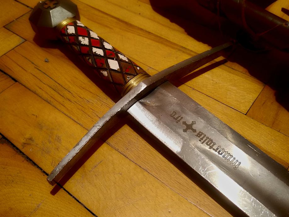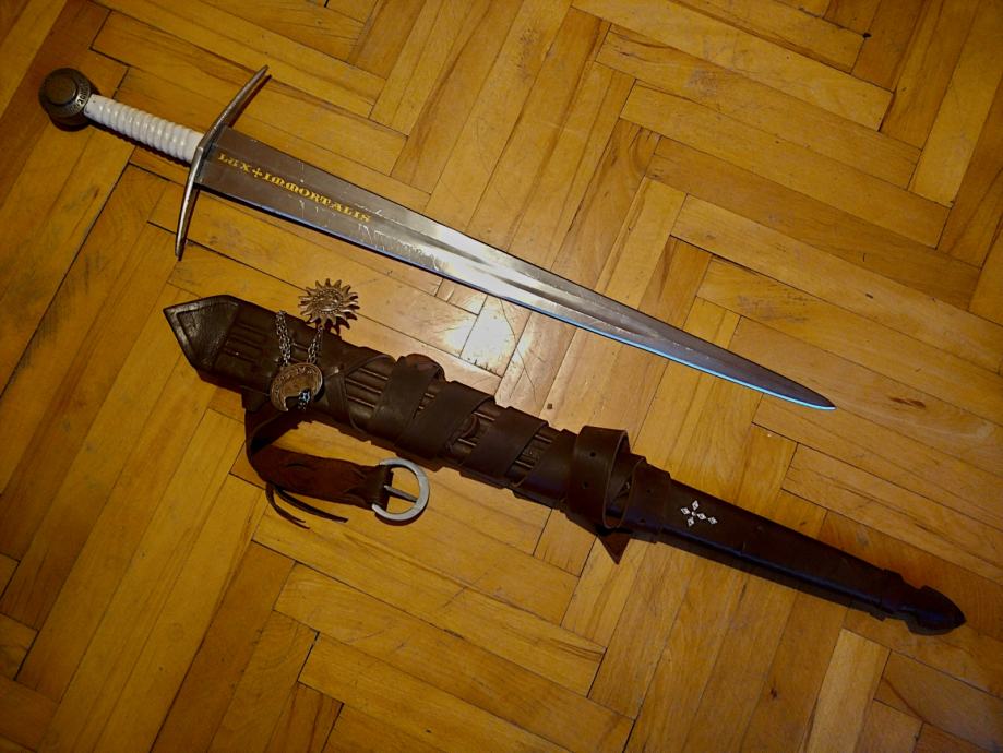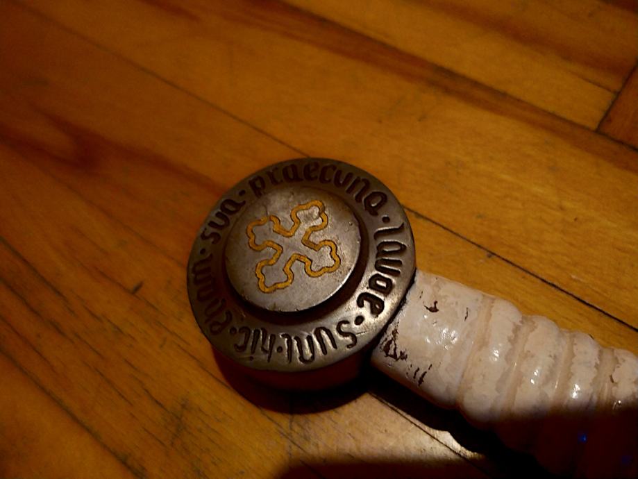 Mač s bijelom drškom: ukupna duljina oko 85cm, fantastično dobar balans, ima pozlaćenu gravuru "Lux Immortalis" (Besmrtno svijetlo), te pozlaćen križ na pečatu.