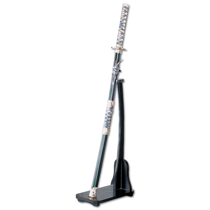 Drveni stalak za katanu i mač koji omogućuje okomito izlaganje mača.