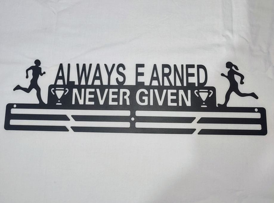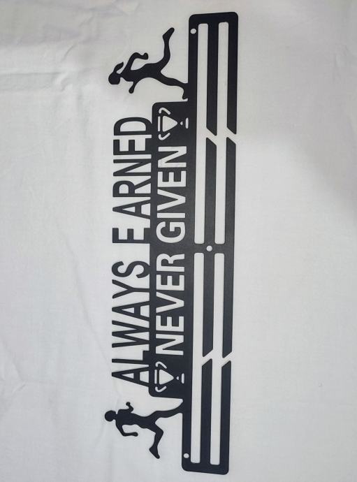 Prodajem potpuno novi stalak za medalje s motivacijskom porukom "ALWAYS EARNED NEVER GIVEN". Modernog je dizajna s prikazom trkača i trofeja, savršen za izlaganje sportskih postignuća. Izdržljiv metalni stalak crne boje s više šipki za vješanje medalja.Dimenzije 40x16.Tiple i vijci u paketu.