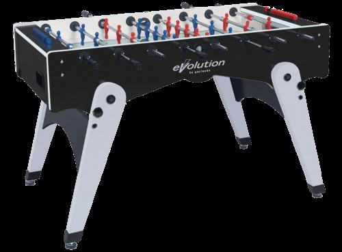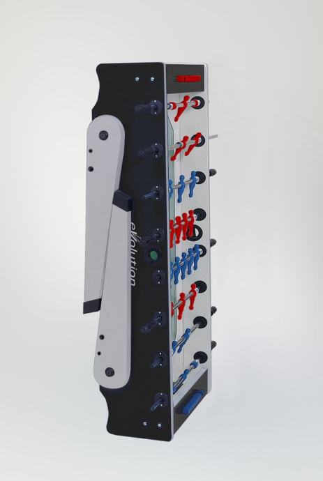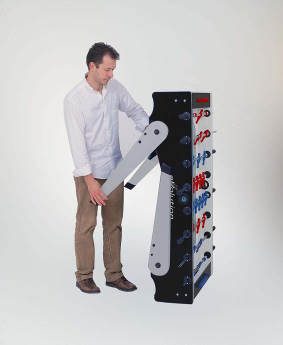 Elegantan model u srebrnoj i crnoj boji sa sklopivim nogama za uštedu prostora. Idealan za mjesta gdje stolu nije moguće dati zaseban prostor jer se nakon korištenja može lako spremiti. Konstrukcija ima dva kotačića, koji kada su noge sklopljene, omogućuju jednostavno premještanje. Nivelatori omogućuju savršenu igru na neravnim podlogama. Crveno-plavi igrači, ergonomske ručke i dizajn linije Evoluton, razlikuju ovaj model od klasičnog plavog modela.