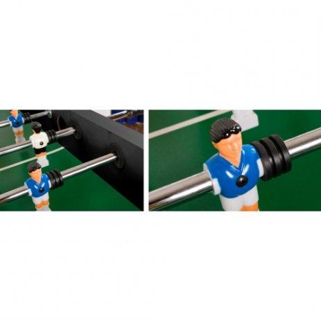 Tijelo stolnog nogometa od MDF-a, nožice, zaštita rubova, kromirani klizni ležajevi, po visini podesive kromirane noge s gumenom presvlakom (za pravilno poravnanje stola), ležaj šipki kliznim ležajevima (bolje od kugličnih ležajeva) , jer su robusniji i manje otporni na habanje - u profesionalnom sportu koriste se samo klizni ležajevi)