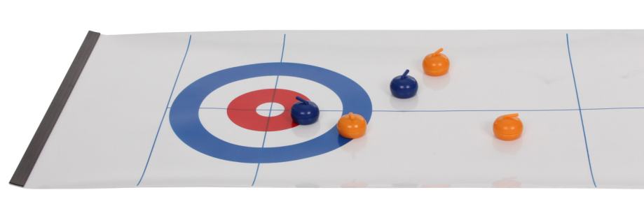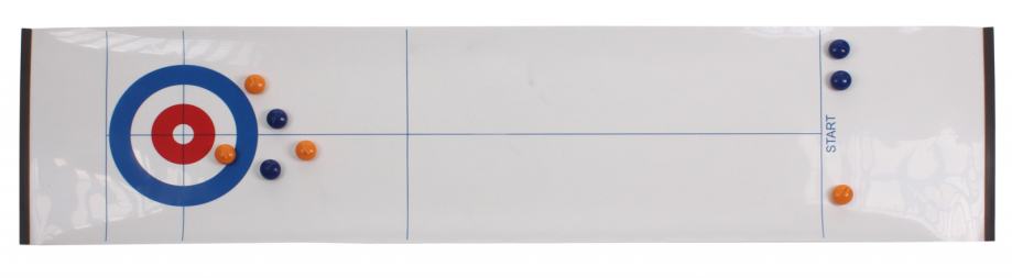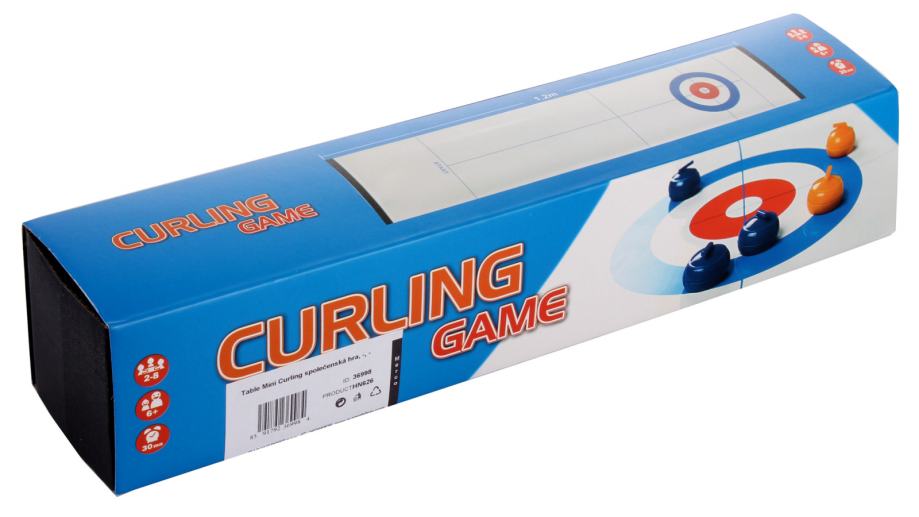 Umanjena stolna verzijaTable Mini Curling dolazi u setu koji sadrži sjajnu igraću plohu dimenzija 120 x 28 cm i 8 igraćih kamena u dvije boje, izrađenih od ABS plastike s unutarnjom metalnom kuglom promjera 26 mm i težine 20 g. Kompaktna verzija pogodna je za djecu stariju od 6 godina i odrasle, a pogodan je za igru u zatvorenim i otvorenim prostorima. Pakiranje je dimenzija 36 x 7,5 x 7,5 cm te težine 470 g.
