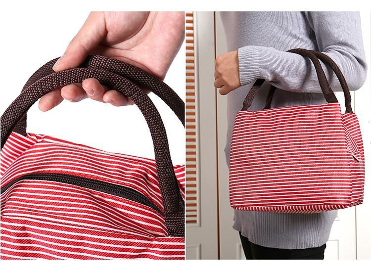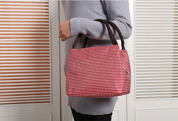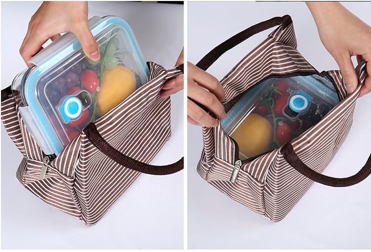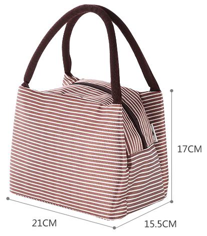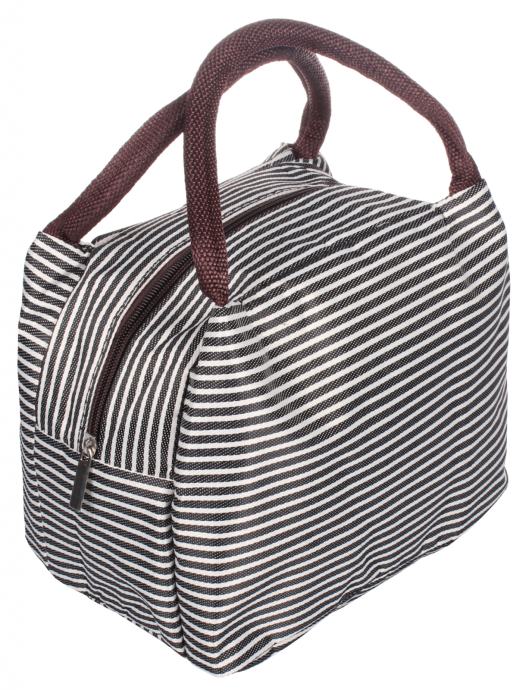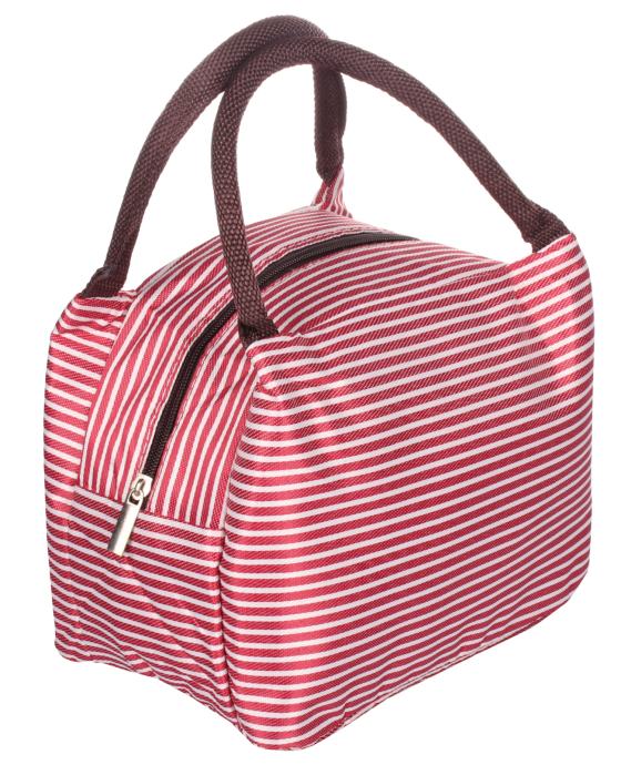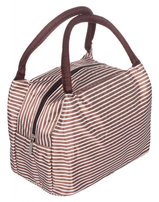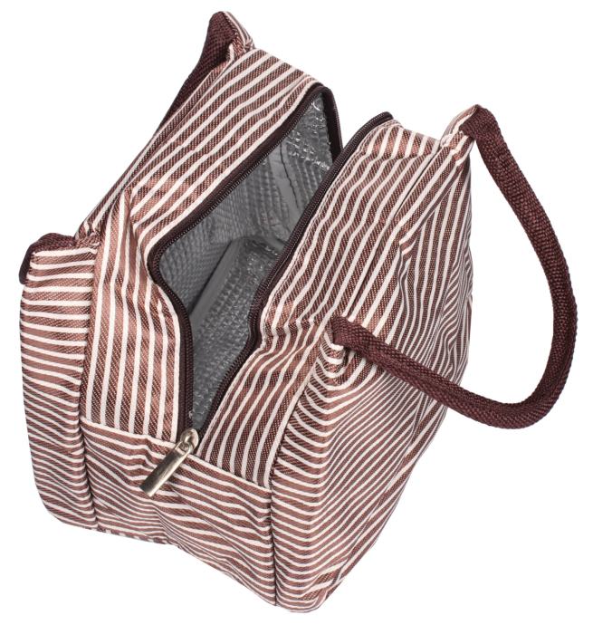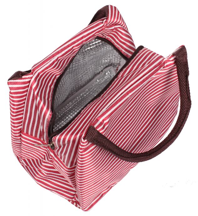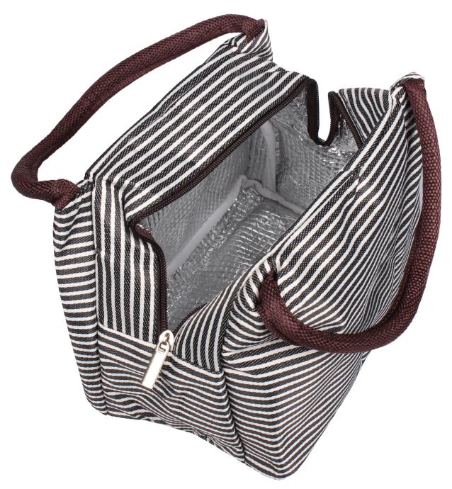 Termo torba Merco dimenzija je 21 x 15,5 x 17 cm a izrađena je od Oxford tkanine atraktivnog dizajna na pruge. Torba ima patentni zatvarač i dvije čvrste ručke za prenošenje. Torbu nemojte prati u perilici za rublje nego ju čistite vlažnom krpicom.