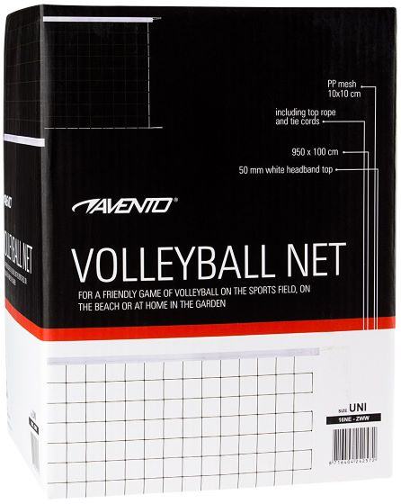 Mreža za odbojku Avento Volleyball Net s užetom (2 užeta za vezanje cca 30 cm s obje strane). Avento je izrađena od 100% polipropilena, dimenzija je 950 x 100 cm, dimenzije očica su 10 x 10 cm. S gornje strane mreže ušivena je traka širine 5 cm.