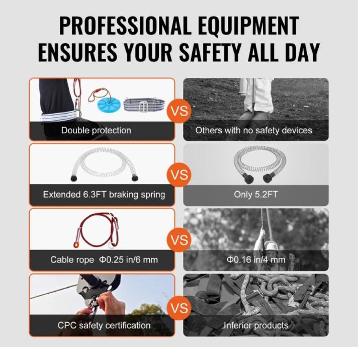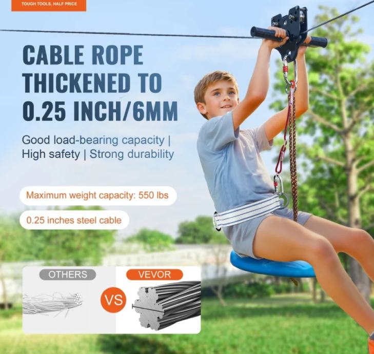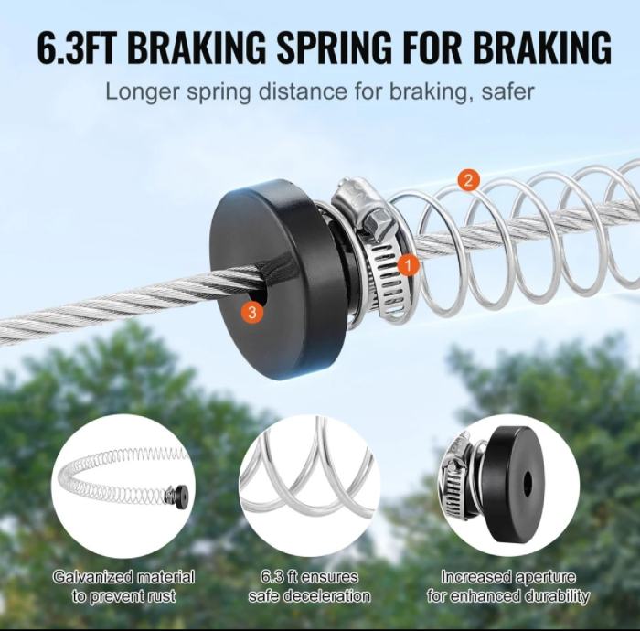Ovaj komplet zip line-a je pogodan za obiteljske zabave i druge aktivnosti. Izdržljivi materijal i opružne kočnice od nehrđajućeg čelika pružaju sigurnost.