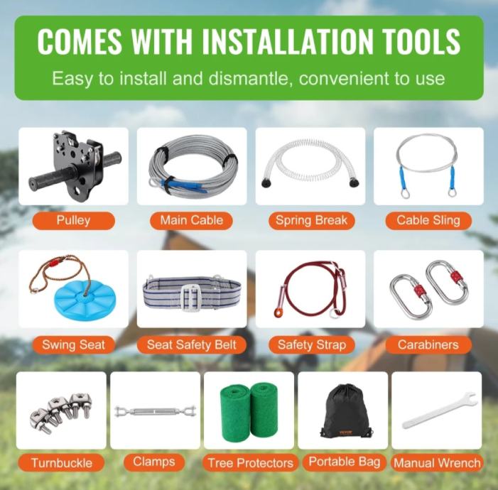 Dobivate kompletnu zip line opremu, uključujući glavno uže, dodatno uže, sjedalo, sigurnosni pojas za djecu, torbu za pohranu, zaštitu za laktove, zaštitu za koljena i niz drugih dodataka.
