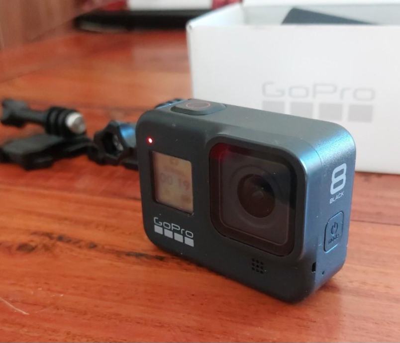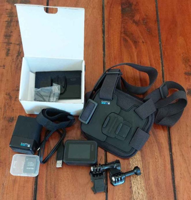 GoPro 8 black, baterije i punjač, adapter/sd kartica Samsung 124 GB, prsni nosač, funkcionalno u dobrom stanju