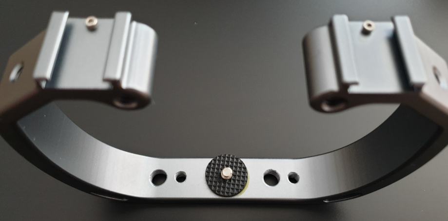 Nosač ima 2 cold shoe mounta za montiranje svjetla , mikrofona , monitora itd.. vezicu za ruku i rupe sa navojima za montažu...