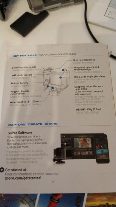 Kamera je očuvana i malo korištena .Uz nju dolazi Gopro goosneck, Kingston micro SD kartica od 16GB, USB kabel i vodootporno kučište.