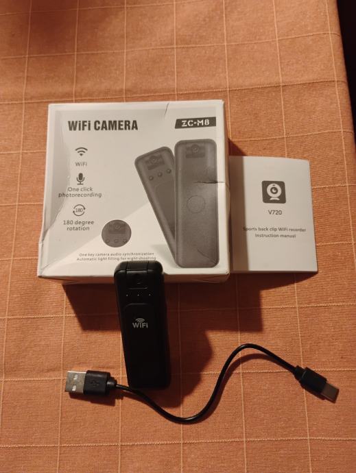 Nova wi-fi kamera sa punjačem, baterijom i sd karticom. Odlična mala kamera koja se može lako zakačiti na auto, romobil, bicikl ili odjeću. Snima po noći, ima senzor pokreta, okreće se za 180 stupnjeva, fotoaparat, može ići sd kartica do 128 gigabajta, također snima i zvukove- razgovore a gledanje je preko mobitela ili računala. Instalira se besplatna aplikacija i kamera je spremna za upotrebu.