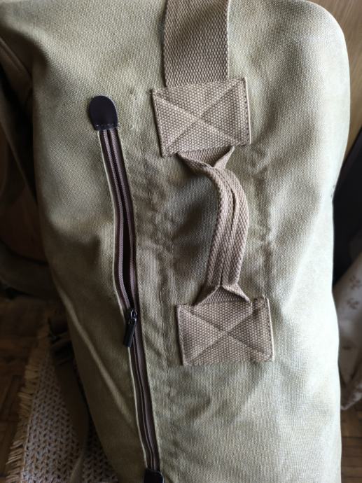 Potpuno novi, izdržljivi sklopivi ruksak (torba) s podesivim naramenicama, većih dimenzija, 'kaki' (svjetlo smeđe) boje, od čvrstog platna - ne od plastike...