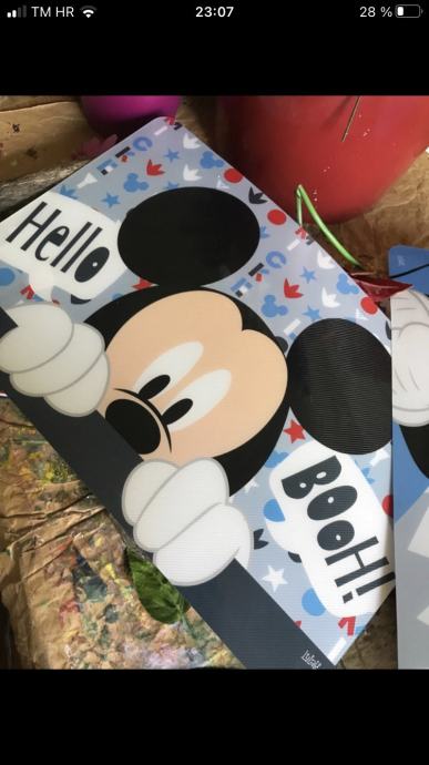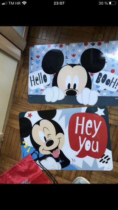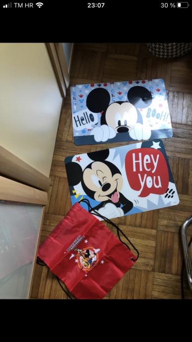 Prodajem novi set koji se sastoji od podmetača s Mickey Mouse motivom i crvenog ruksaka. Komplet je u odličnom stanju, bez etikete, idealan za djecu i obožavatelje Disney likova. Podmetači su veselog dizajna s natpisima "Hello" i "Hey You" koji će uljepšati svaki stol.