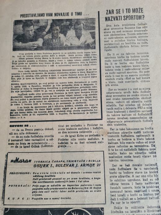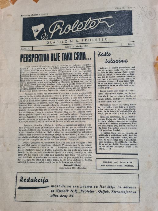 Glasilo NK Proleter - NK Osijek 18.03.1956. BROJ 1