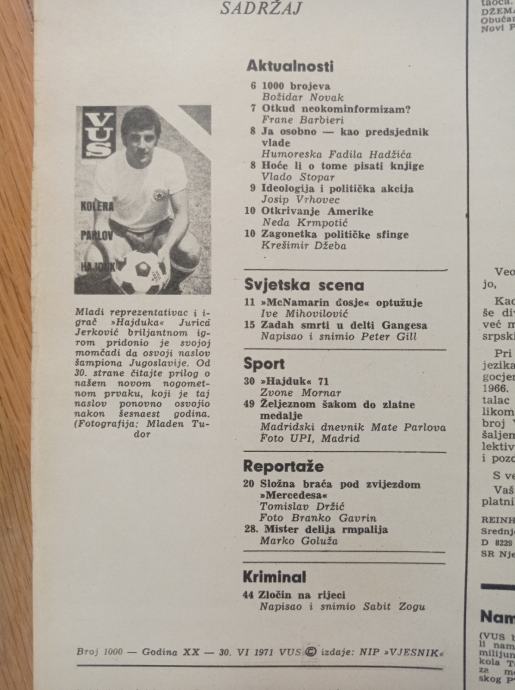 VUS Hajduk Split naslovnica poster i članak 1971 Jerković