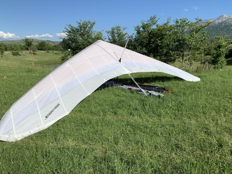 Prodajem Seedwings Space 16, 2008. u odličnom stanju. Mylar na prednjem rubu bez oštećenja, novi klipseri na rebrima, dvi donje šipke trokuta, dva para kola, zastitna navlaka tanka i dodatna vodonepropusna.