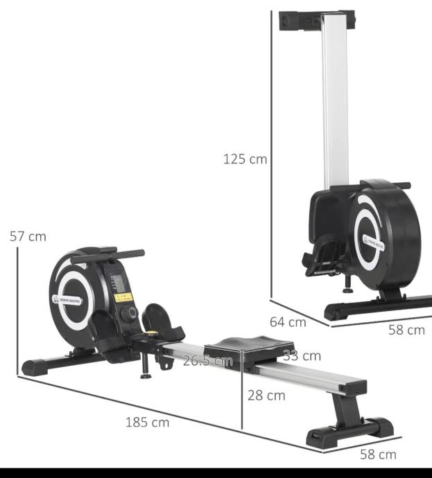 Dimenzije sprave su 185 cm dužine, 58 cm širine i 125 cm visine u uspravnom položaju. Sjedalo se nalazi na visini od 26 cm, a sama jedinica s kotačem za veslanje ima dimenzije 64 x 58 cm. Stabilna baza osigurava siguran trening.