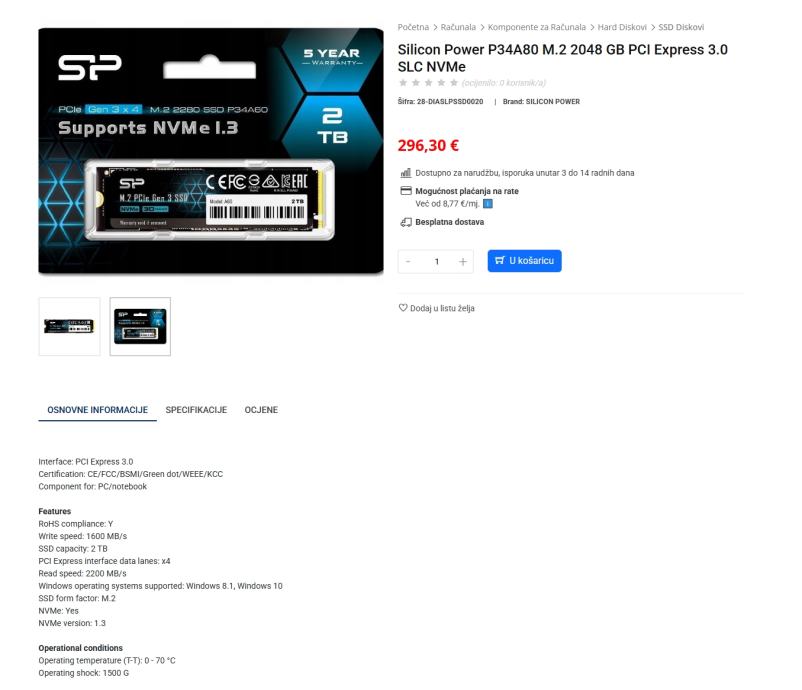 Prodajem : Silicon Power Ace A60 SSD disk, 2TB, M.2 PCIe (SP002TBP34A60M28)