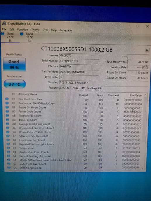 Prodajem navedeni SSD. 2.5" Testiran, ispravan. Svega 50 radnih sati. Bez zamjena, nemam račun niti dajem garanciju.