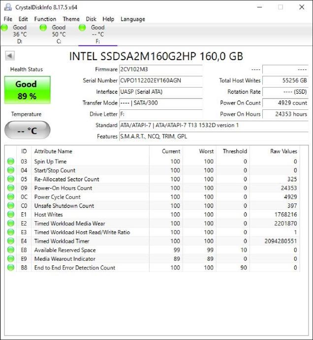 2,5' intel SSD, 160GB, koristio sam ga od 2013 do prije dva mjeseca. U prilogu su informacije sa crystaldiska.