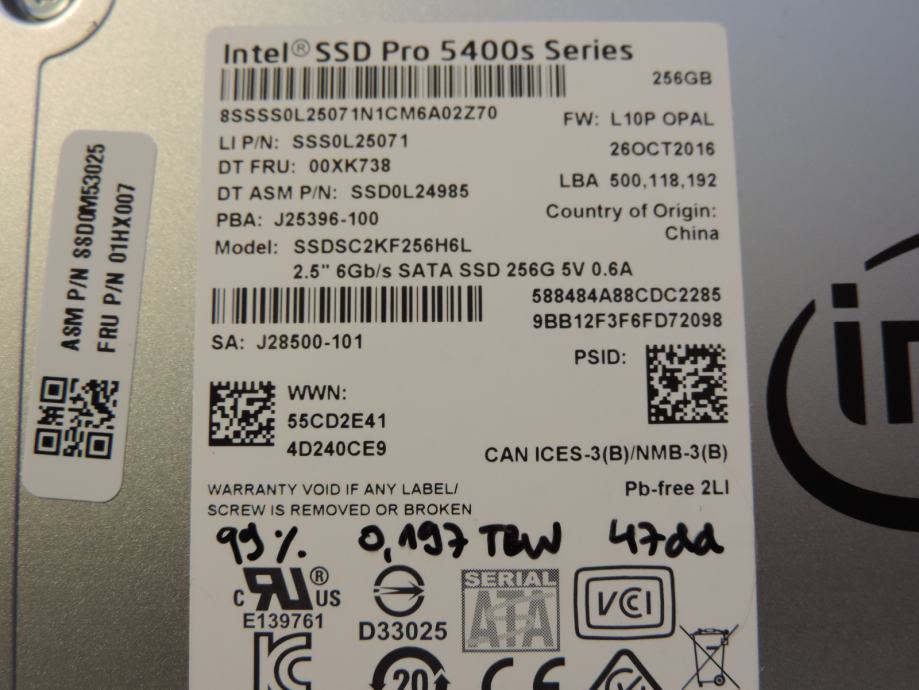 Na prodaju jako malo korišteni SSD INTEL PRO 5400S SERIJE od 256GB u formatu 2.5", SATA III priključak. Model je SSDSC2KF256H6L, P/N sss0l25071, F/W L10P OPAL. Nalazi se u odličnom estetskom i funkcionalnom stanju, bez oštećenja ili detalja. Priključci neoštećeni i bez problema. Sve radi kako treba. Izvađen iz Lenovo ThinkPad laptopa, Lenovo FRU 00XK738 / 01HX007.