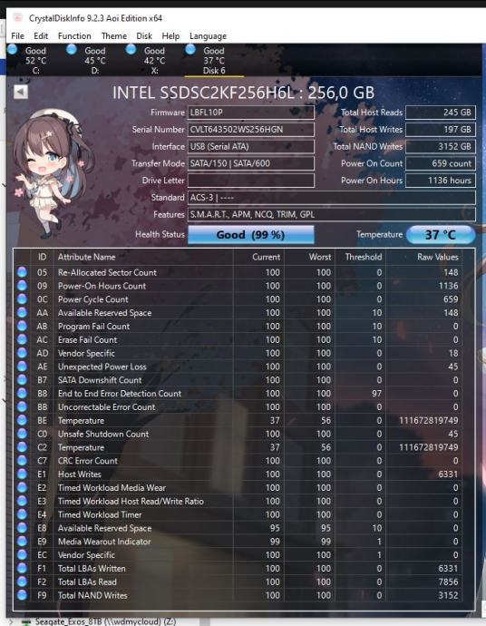 Testiran i 100% ispravan. Napravljen LLF (Low Level Format) koji je prošao bez greške, nakon čega su testirani svi sektori sa HD Tune programom. Ispis SMART statusa nalazi se na slikama. S.M.A.R.T. status ukazuje na perfektno zdravlje i minimalno 99% preostalog životnog vijeka (wear level) i samo 197GB pisanja (0,197TBW) što je dovoljno za mnogo više od 10 godina normalne uporabe. Nema potrošenih rezervnih blokova ili ikakvih prošlih problema.