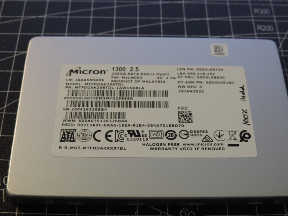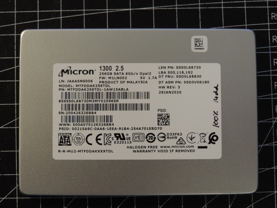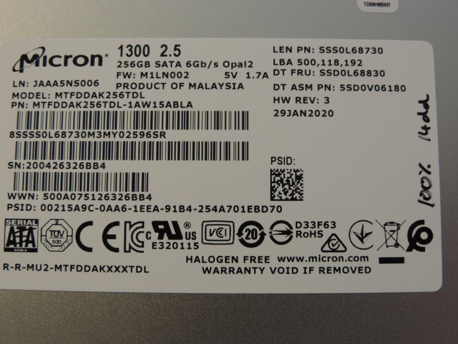 Na prodaju NOVI, samo testirani i jednom instaliran sustav, SSD MICRON 1300 SERIJE od 256GB u formatu 2.5", SATA III priključak. Model je MTFDDAK256TDL, P/N MTFDDAK256TDL-1AW15ABLA, F/W M1LN002 OPAL2. Nalazi se u odličnom estetskom i funkcionalnom stanju, bez oštećenja ili detalja. Priključci neoštećeni i bez problema. Sve radi kako treba. Izvađen iz nekorištenog Lenovo ThinkPad laptopa, Lenovo FRU SSS0L68730 / SSD0L68830. Posjeduje samo 14 dana rada, praktično nov i samo testiran.