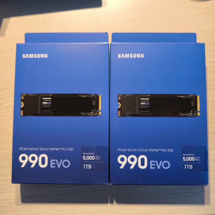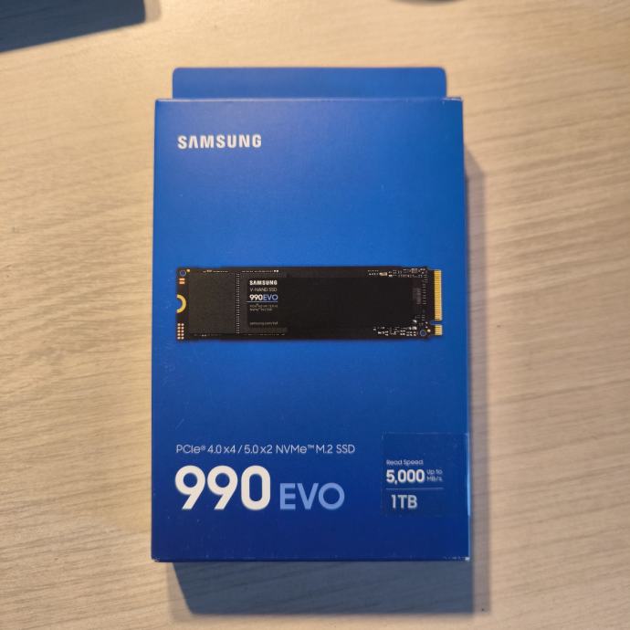 Novi i nekorišteni Samsung 990 EVO SSD kapaciteta 1TB u M.2 formatu s NVMe sučeljem.