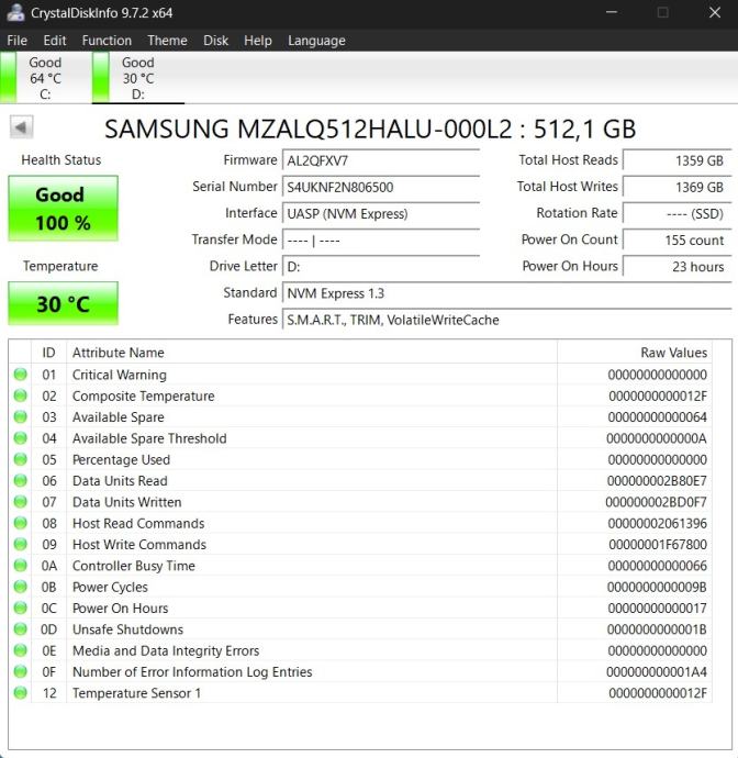 Zdravlje diska: 100%, provjereno putem CrystalDiskInfo