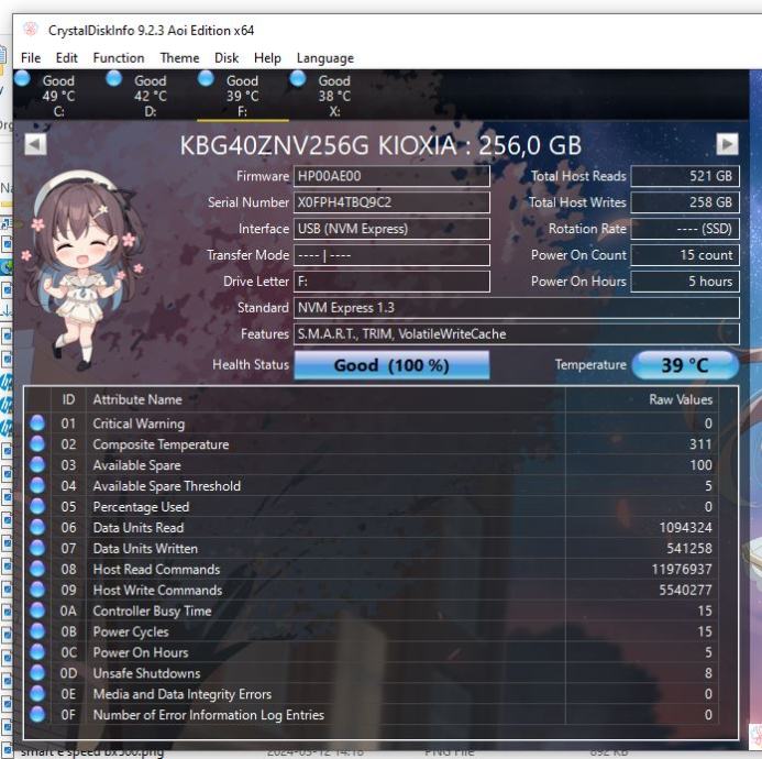 Na prodaju gotovo pa ne korišteni SSD M.2 KIOXIA (u stvari TOSHIBA, odjel je izdvojen iz korporacije Toshiba 2018.g.) izvađen iz novog HP laptopa koji je nadograđen većim SSD-om. Posjeduje 100% zdravlja i jako malo korištenja i pisanja, samo 5 sati rada i 0,258TBW. Nalazi se u odličnom estetskom i funkcionalnom stanju, odlična brzina i rad bez greške. Testiran 100%, LowLevel format i scan svih sektora sa provjerom. HP P/N L57447-001; HP SPS L52005-001. Firmware je također HP.