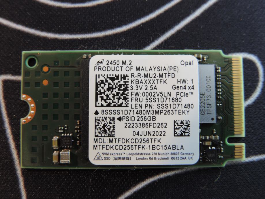 Na prodaju malo korišteni SSD M.2 MICRON 2450 izvađen iz LENOVO laptopa koji je nadograđen većim SSD-om. Posjeduje 99% zdravlja i malo korištenja i pisanja, 24 dana rada i jedva 3TBW pisanja - praktično novi. Nalazi se u odličnom estetskom i funkcionalnom stanju, odlična brzina i rad bez greške. Testiran 100%, LowLevel format i scan svih sektora sa provjerom. Lenovo FRU 5SS1D71680, Lenovo P/N SSS1D71480.