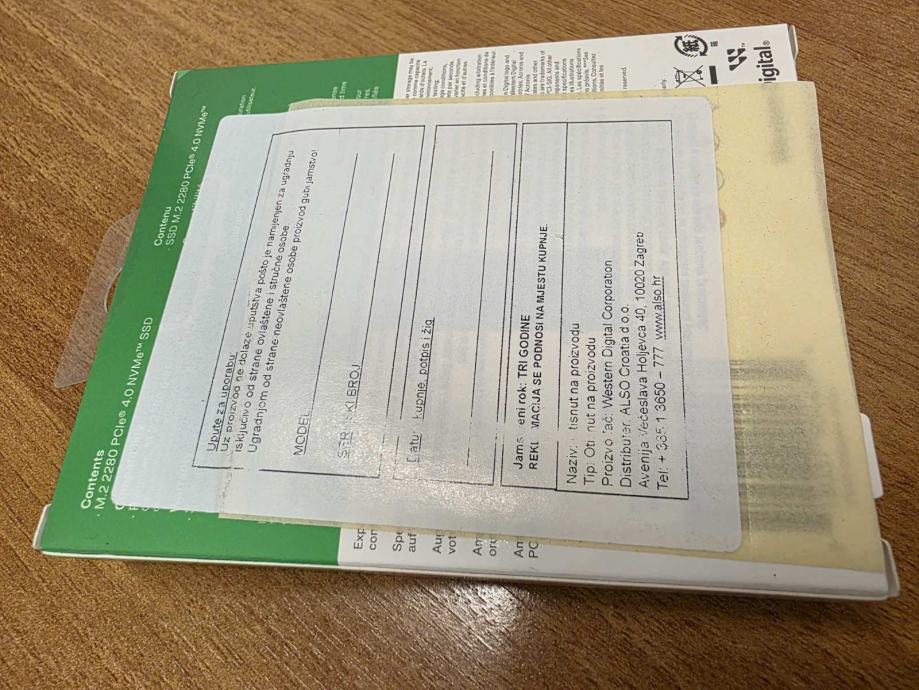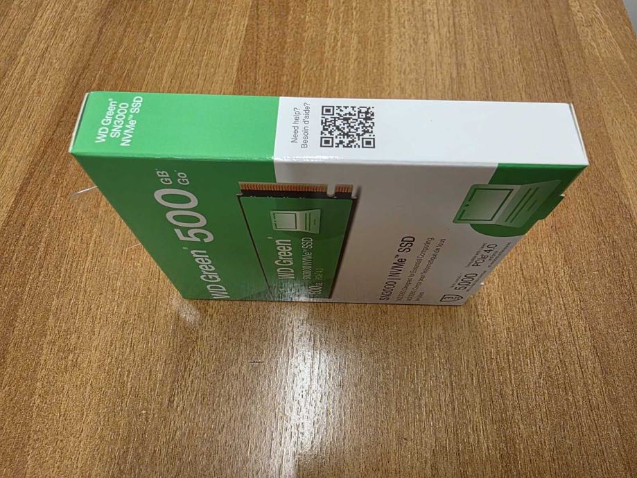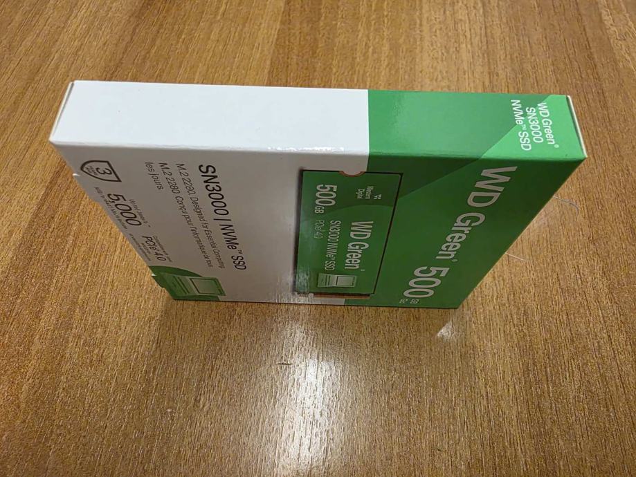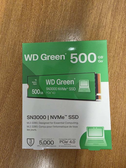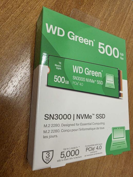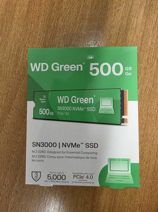 Prodajem potpuno novi, tvornički zapakirani SSD Western Digital (WD) Green SN3000, 500GB, M.2 NVMe PCIe Gen4, R5000/W4100.