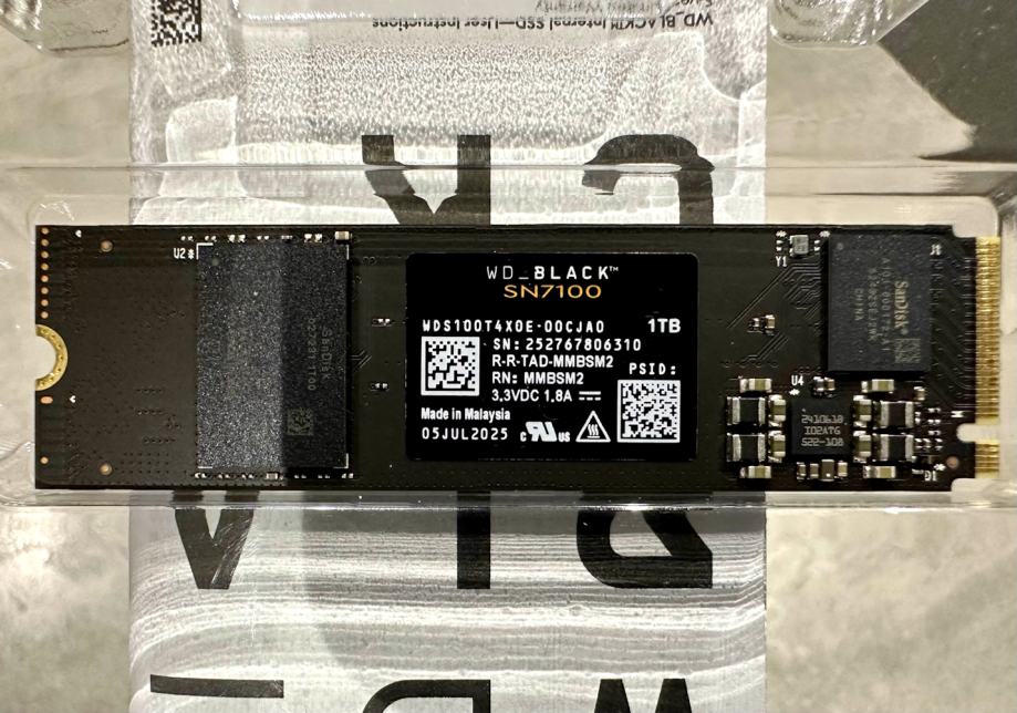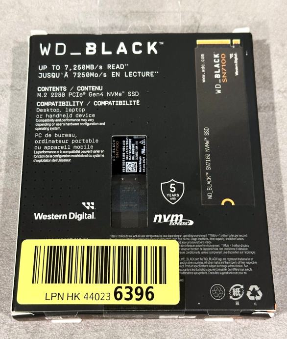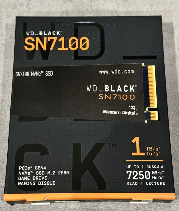 Prodajem novi, tek nabavljen WD_BLACK SN7100 M.2 SSD sa kapacitetom od 1TB, i brzinama od 7250 MBs / 6900 MBs. Radi se o jednom od najbržih Gen4 M.2 SSD-ova. Disk je otvoren i isproban jedanput u svrhu benchmarka brzina (da ne bude neugodnih iznenađenja) i ažuriranja firmwarea na najnoviju verziju. Maloprodajna cijena ovog M.2 SSD-a kreće se između €230 i €280.