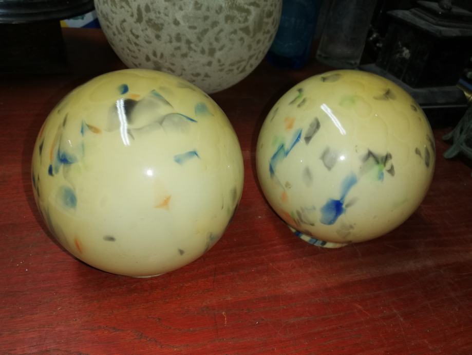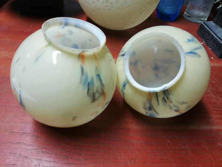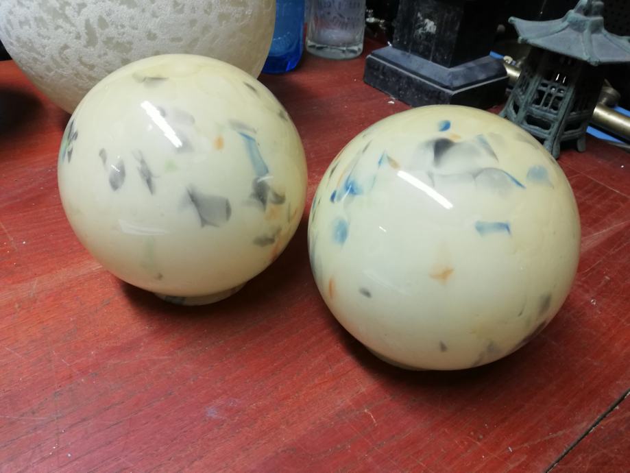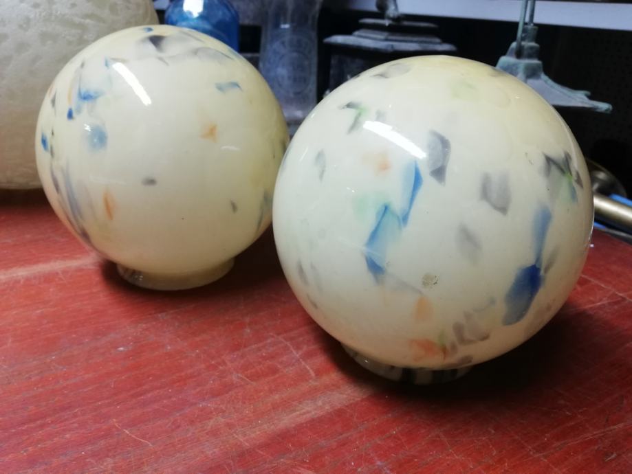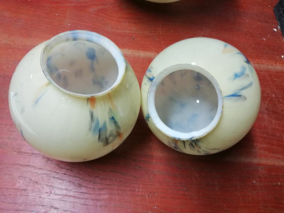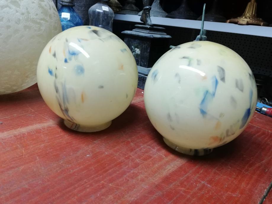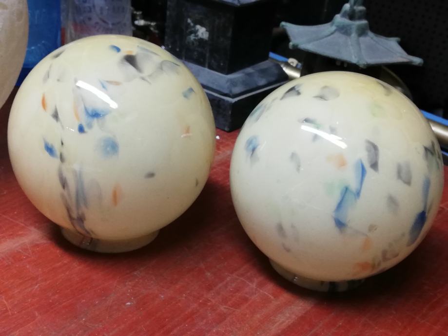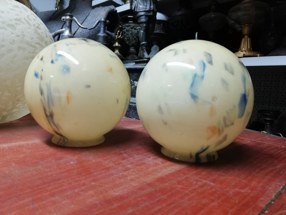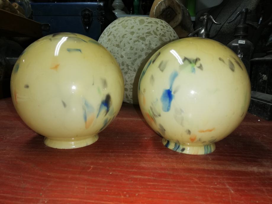 2 identična sjenila za svjetiljku ili luster tzv. kugle, od glatkog šarenog mliječnog stakla, neoštećena, iz 1960-ih godina, promjer sjenila 15 cm, promjer otvora za izvor svjetlosti 6,4 cm.