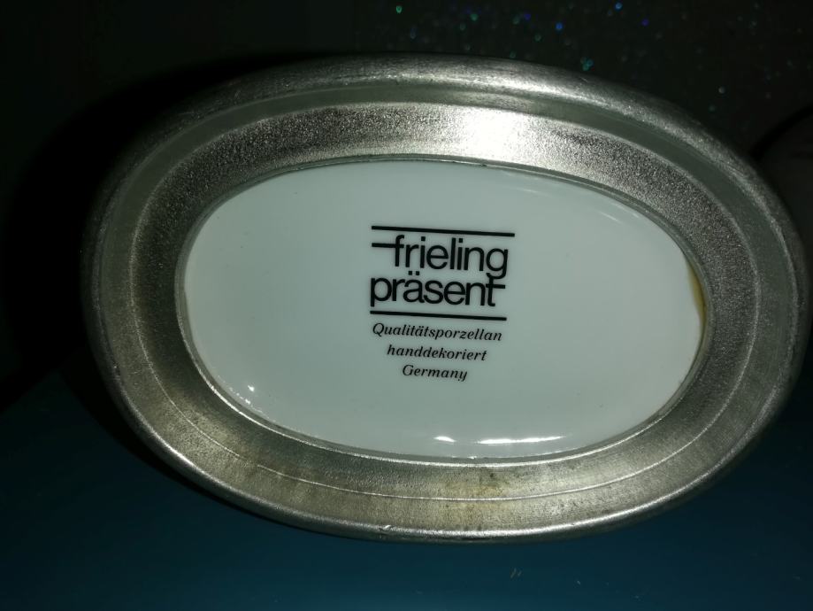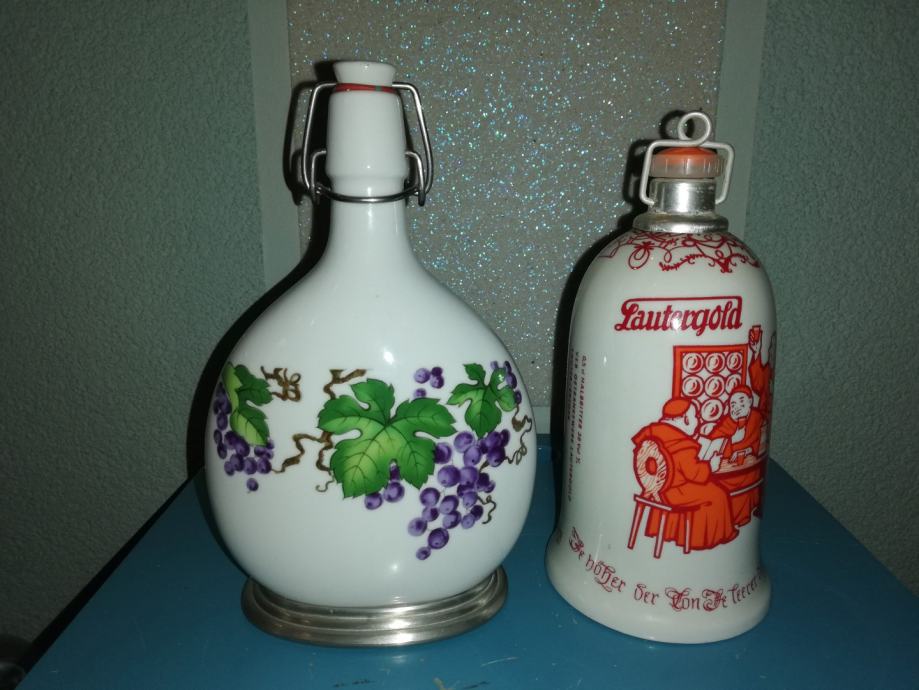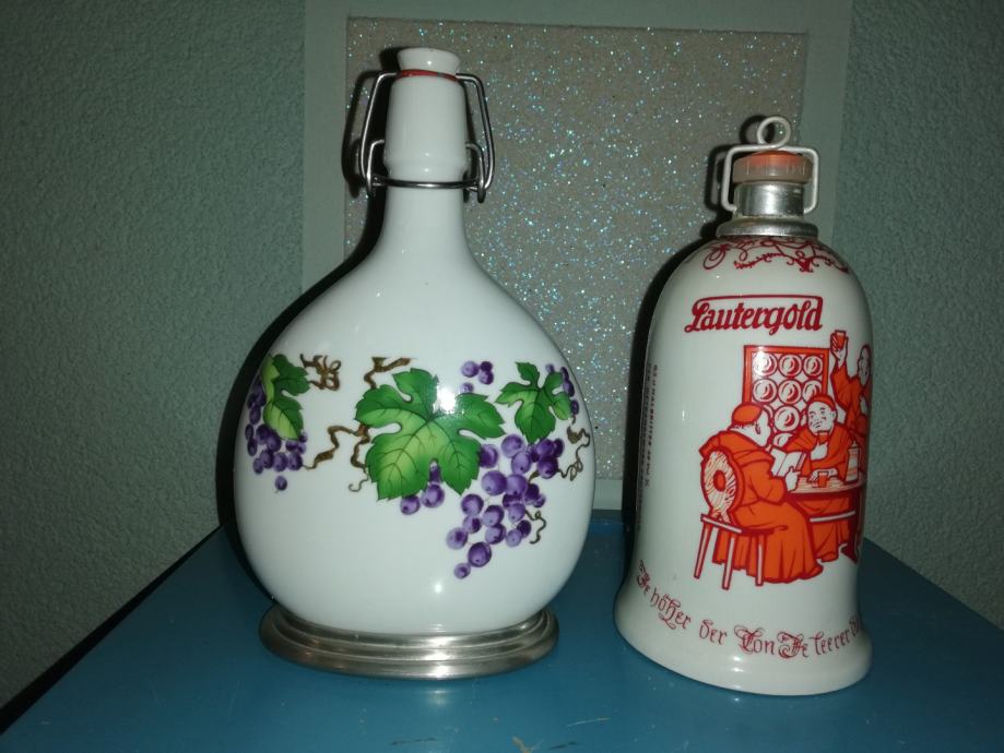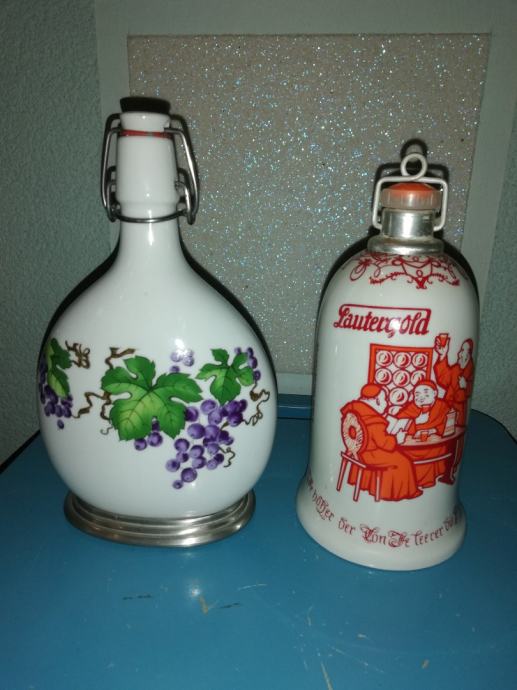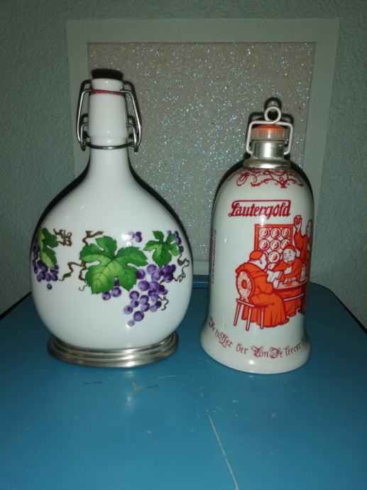 Dvije stare zanimljive porculanske boce. Boca sa grožđem ima dimenzije: visina. 23,5 cm, stopa: 12,0 x 8,5 cm; podrijetlo: zapadna Njemačka; boca sa fratrom ima zvonce u podnožju, dimenzije: visina. 21,5 cm; promjer stope. 10,5 cm, podrijetlo : istočna njemačka. Zanimljivi i neoštećeni primjerci za kolekcionare porculanskih boca.