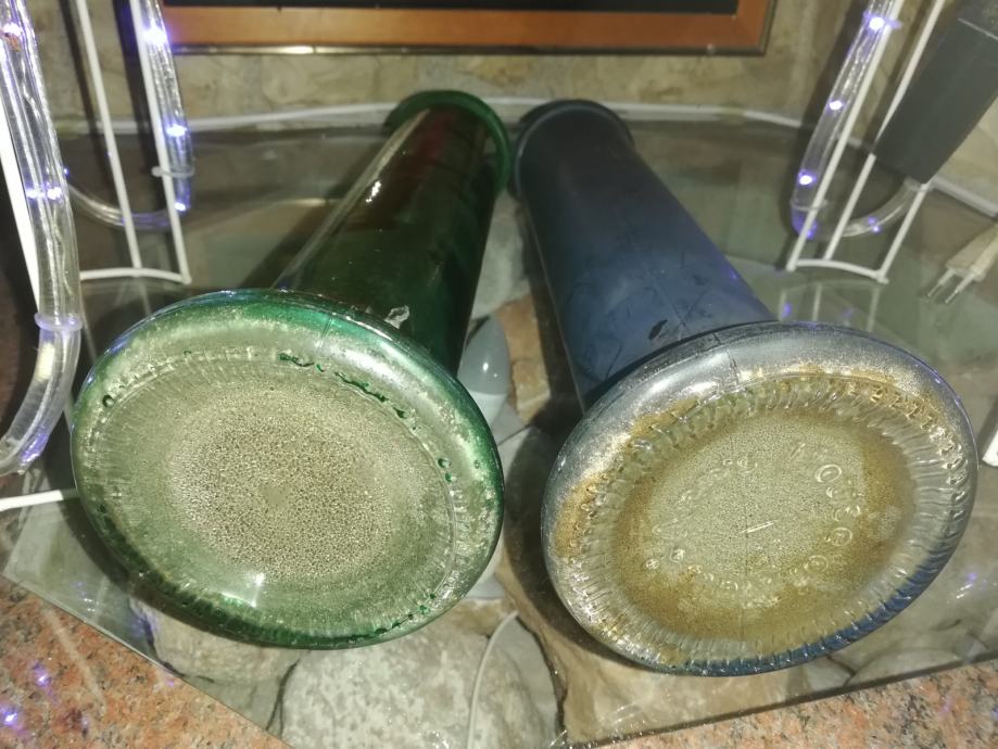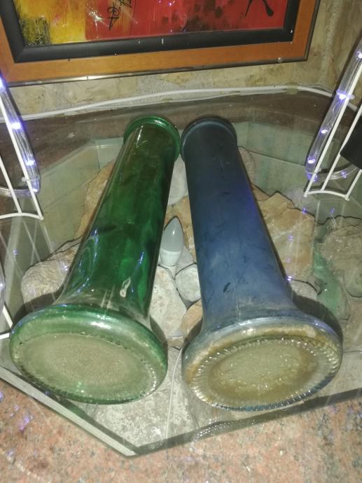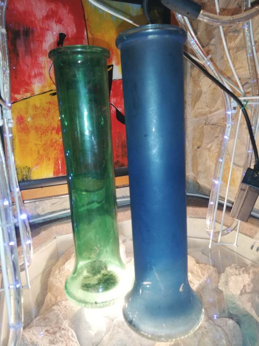 Dvije visoke apotekarske posude od debelog bojanog stakla, plava i zelena, u kojima su se mješali farmaceutski sastojci, dimenzije: visina:35,0 cm, donji promjer 11,0 cm, gornji vanjski promjer:8,0 cm, gornji unutrašnji promjer: 6,5cm. Iz privatne kolekcije, sačuvano bez oštećenja. Napomena:navedena cijena samo u lotu.