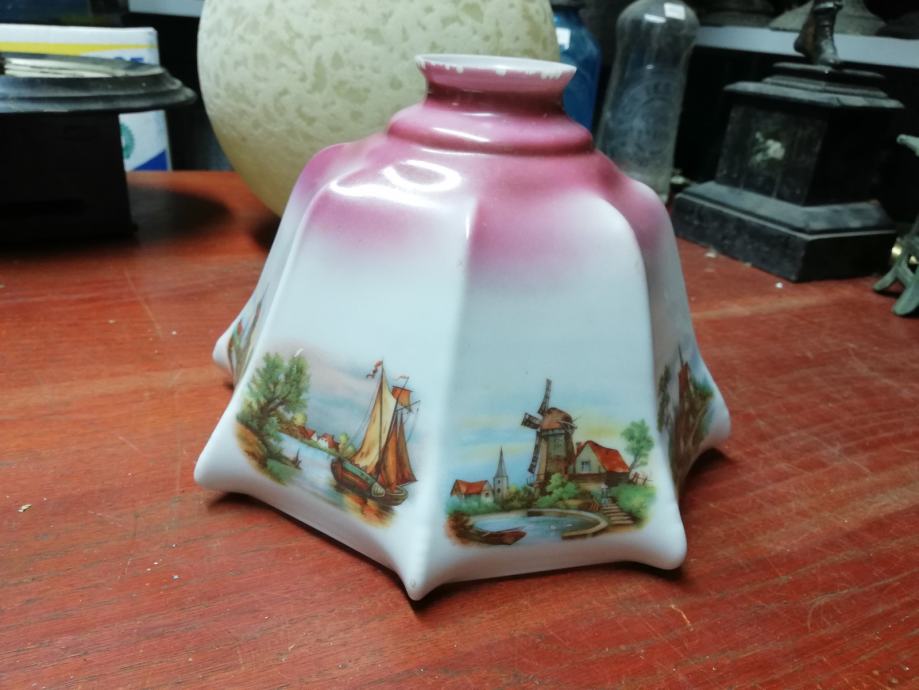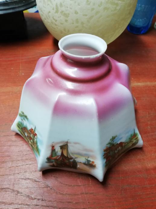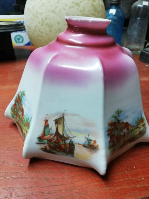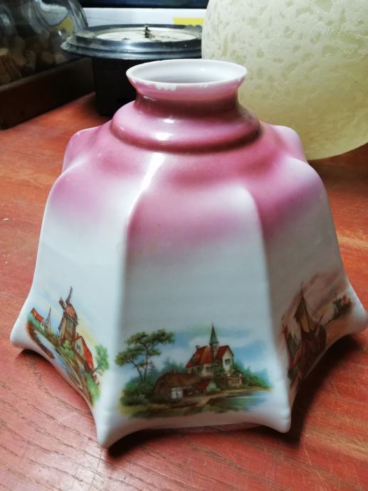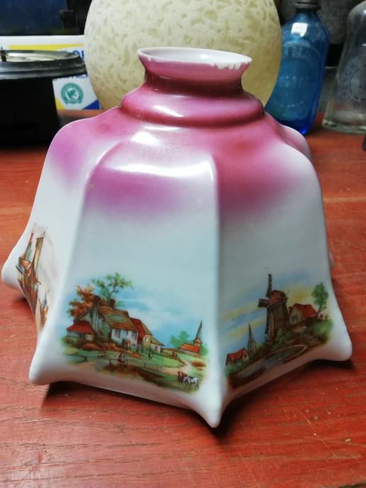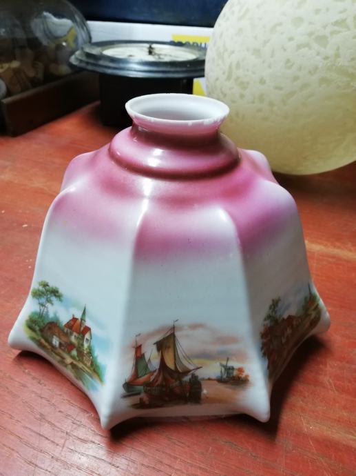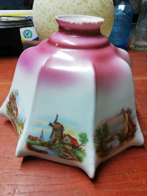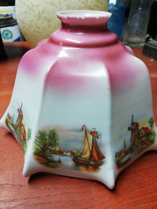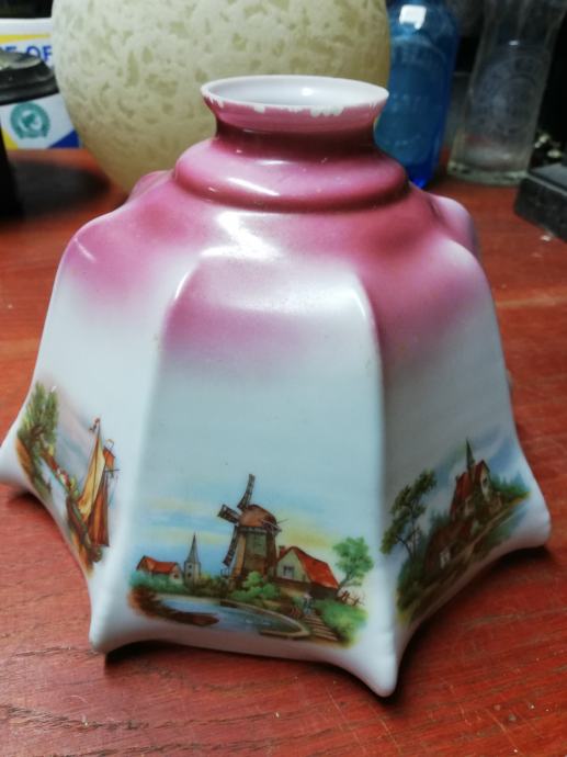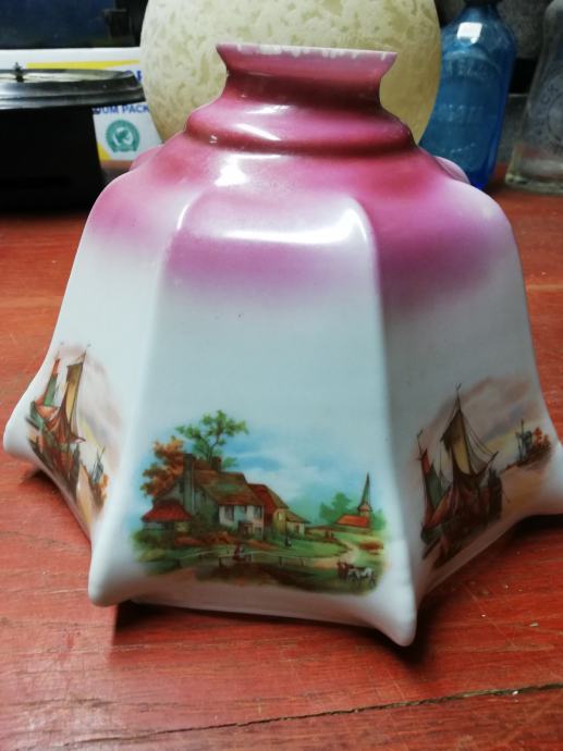8-strano sjenilo za svjetiljku ili luster , od mliječnog stakla,oslikani sa 8 prekrasnih slika neoštećeno, iz 1950-ih godina, visina 15 cm, promjer sjenila cca 23 cm, promjer otvora za izvor svjetlosti 4, 4 cm. Podrijetlo:Nizozemska.