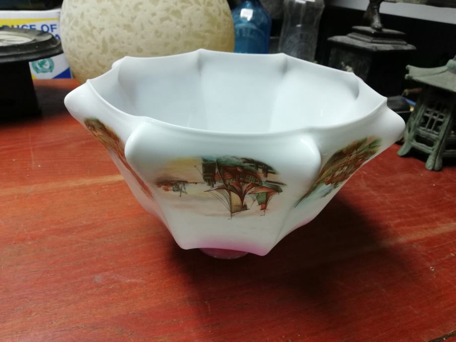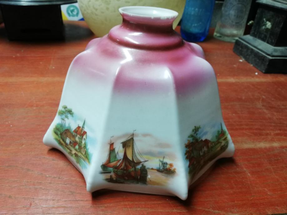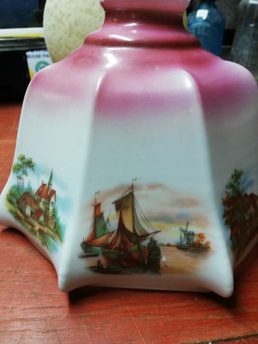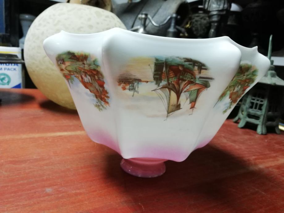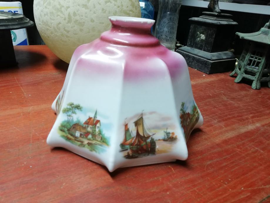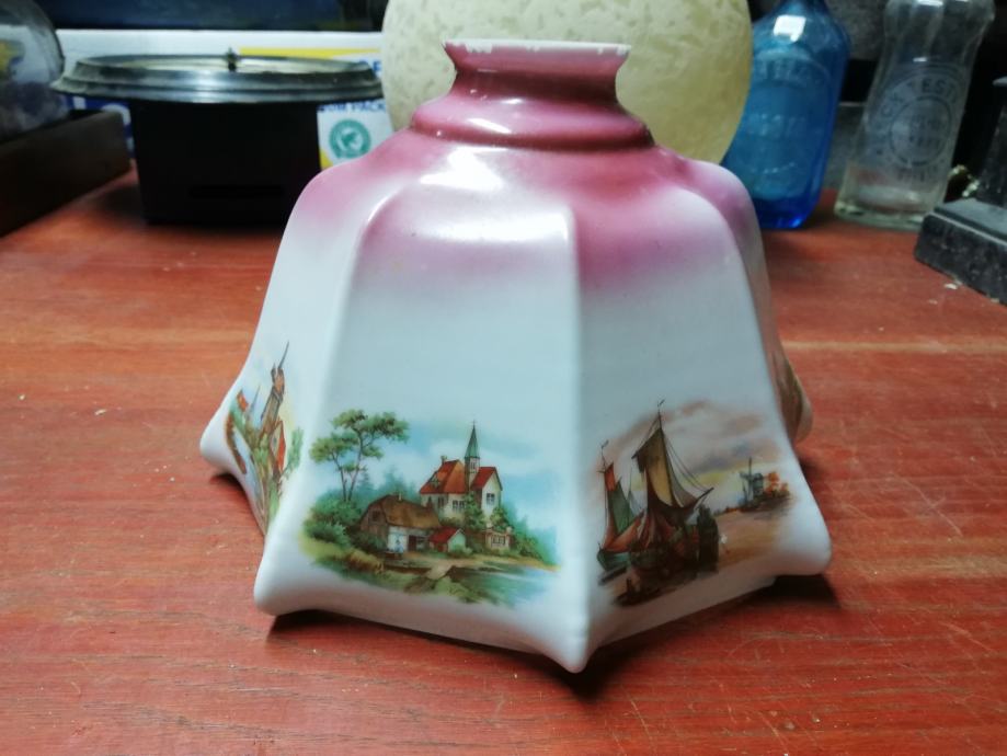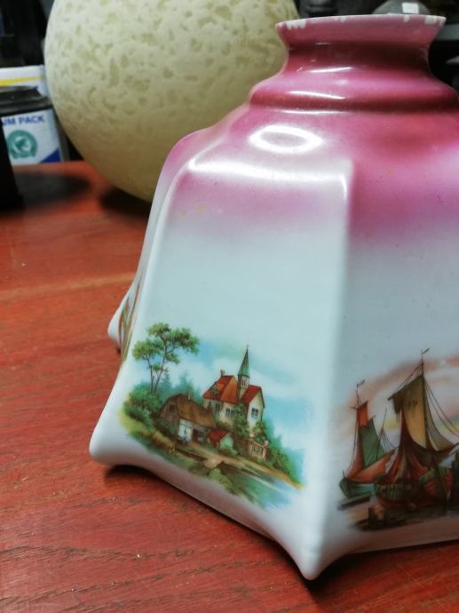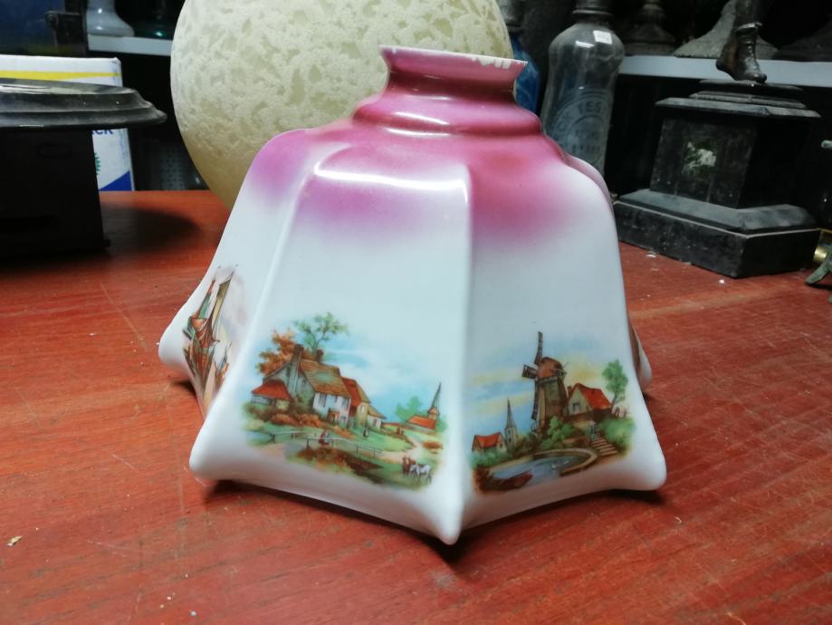 8-strano sjenilo za svjetiljku ili luster , od mliječnog stakla,oslikani sa 8 prekrasnih slika neoštećeno, iz 1950-ih godina, visina 15 cm, promjer sjenila cca 23 cm, promjer otvora za izvor svjetlosti 4, 4 cm. Podrijetlo:Nizozemska.