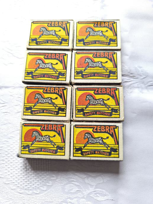 8 kutija šibica ZEBRA, u svakoj kutiji 40 šibica. Starost oko 35 godina.