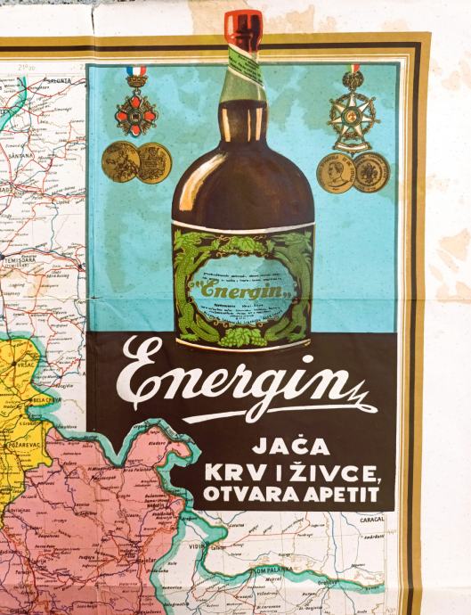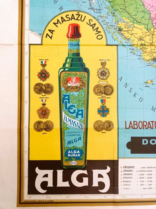 Originalni,visebojni zemljovid Kraljevine iz 1930-te sa reklamama za "Algu Sušak" i pice "Energin".