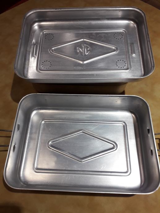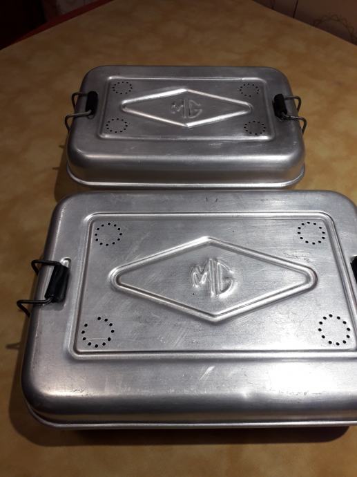 dvije vintage aluminijske posude za hranu sa zatvaračem (MG) u dobrom stanju, idealno za putovanja,piknik, dimenzije 25x17x9 i 22x16x8. cijena po komadu 80kn