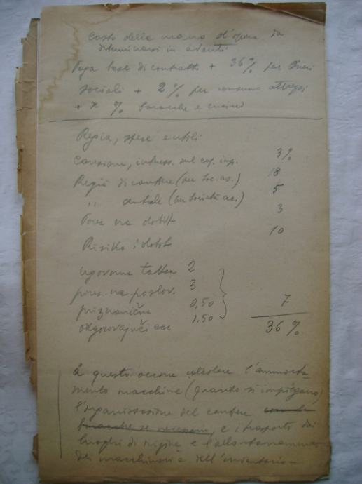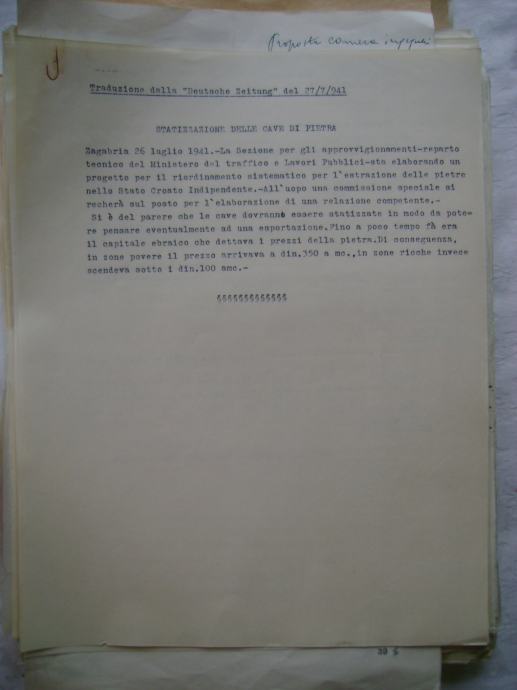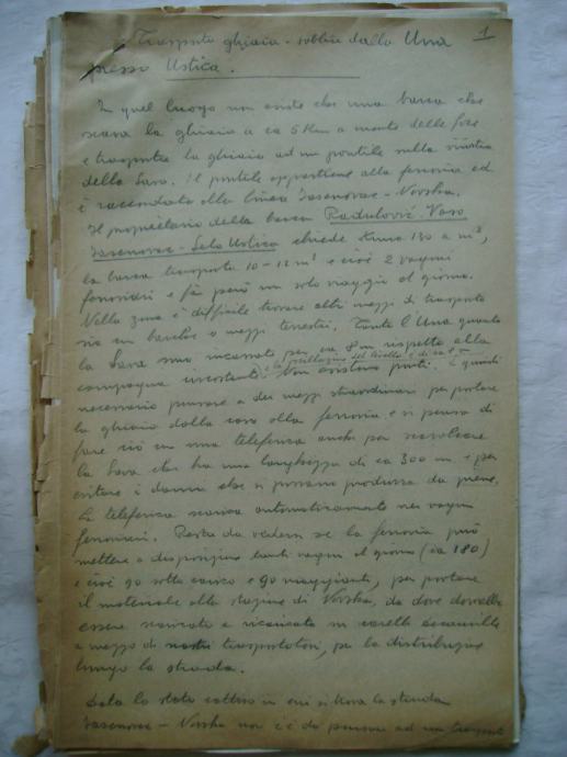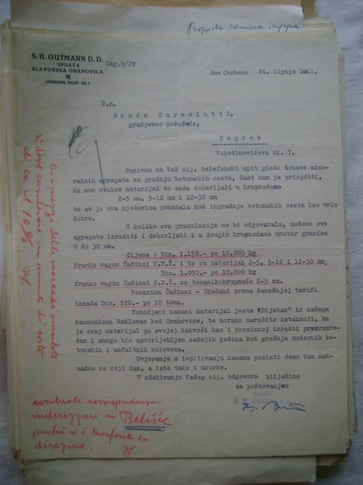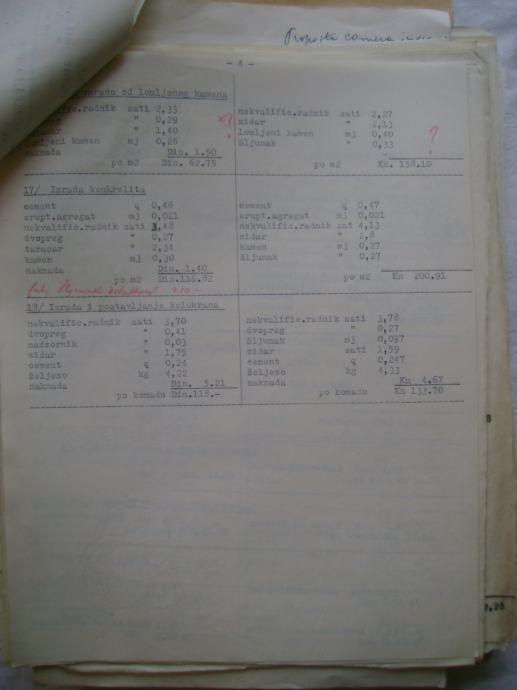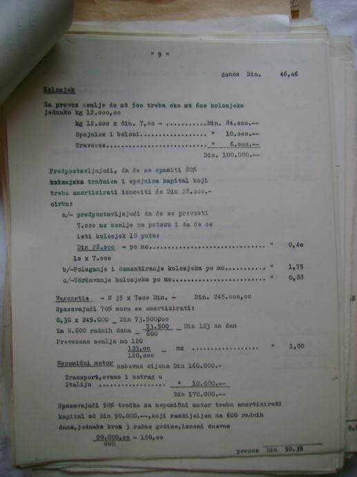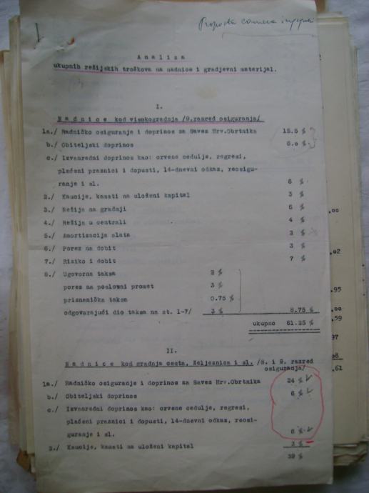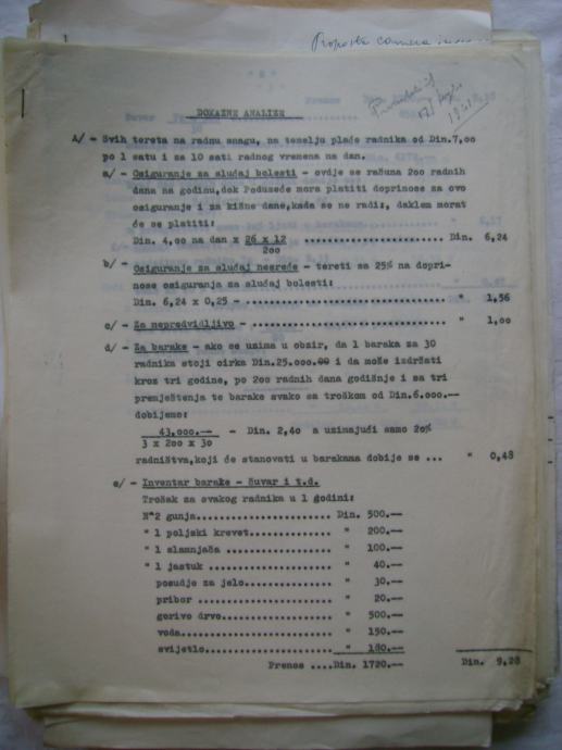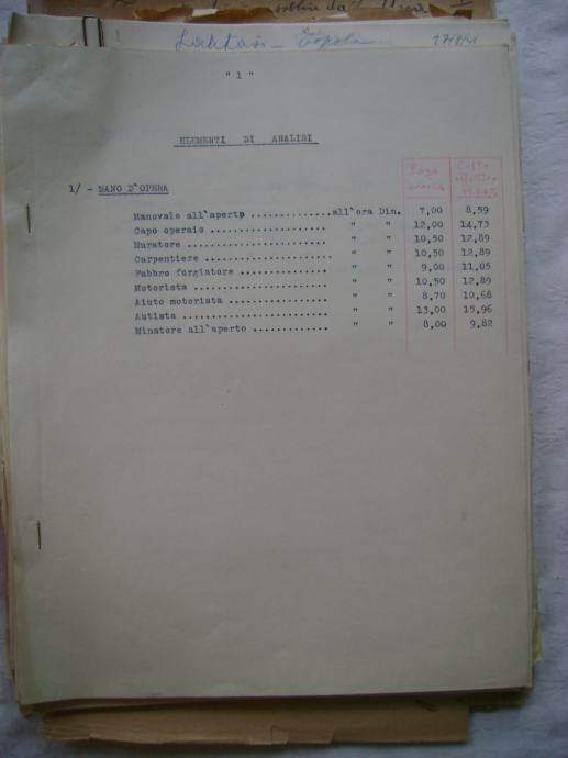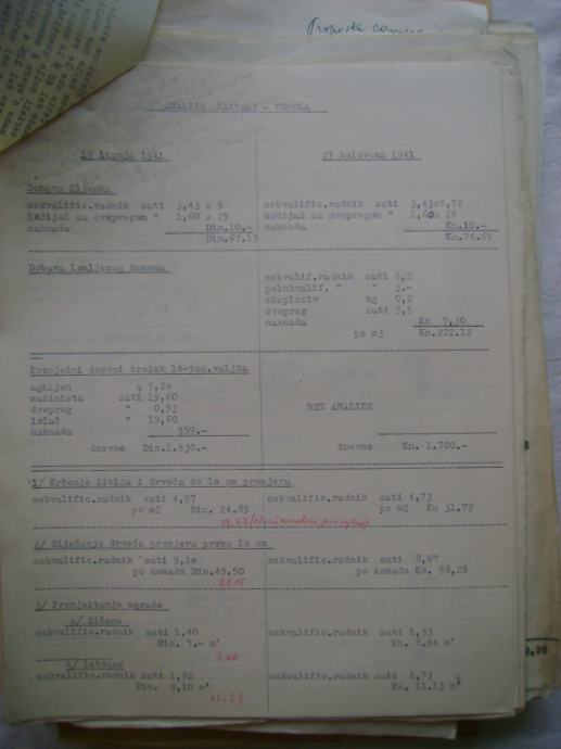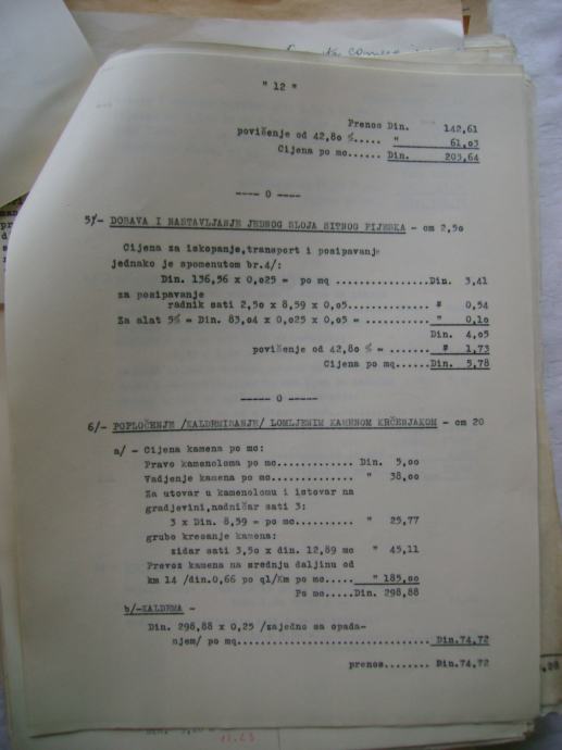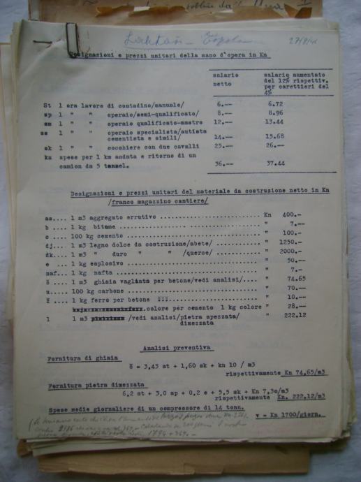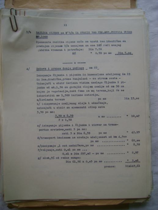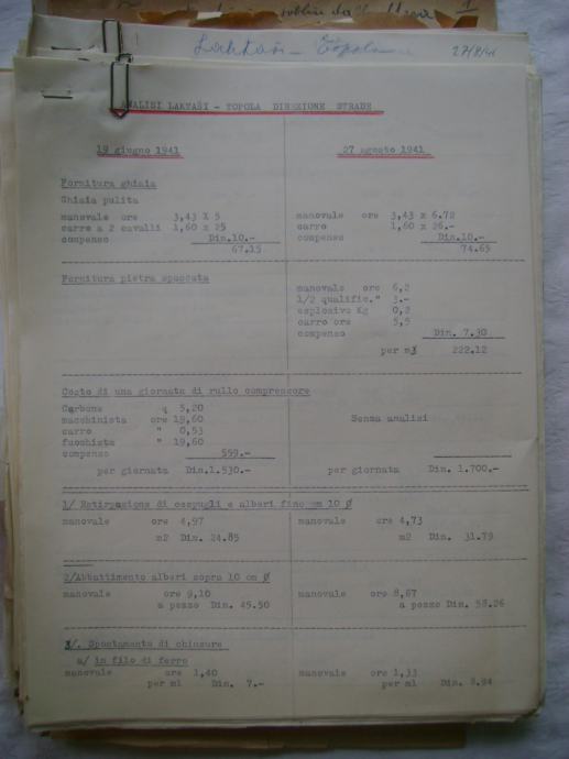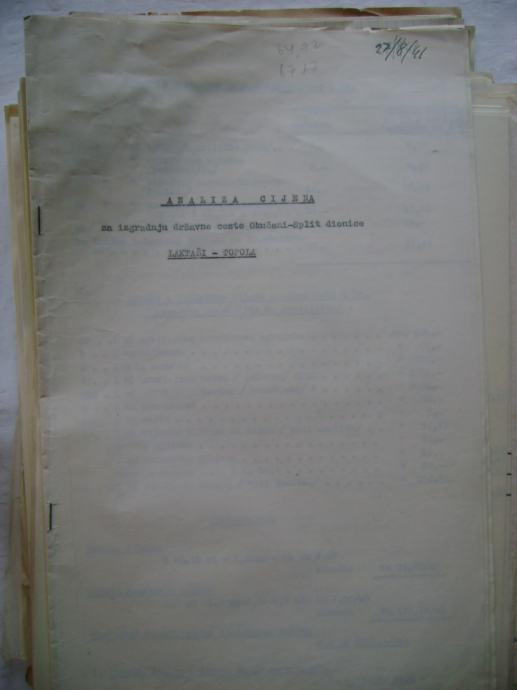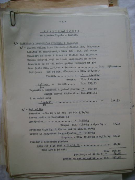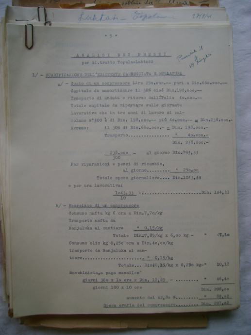 Analiza cijena za izgradnju državne ceste Okučani-Split ; dionica Laktaši-Topola iz 1941. godine, na hrvatskom i talijanskom jeziku, većina je pisana na pisaćoj mašini, ali ima i rukom pisanih, neki dokumenti su u više primjeraka (duplikati) - stanje je vidljivo na slikama.