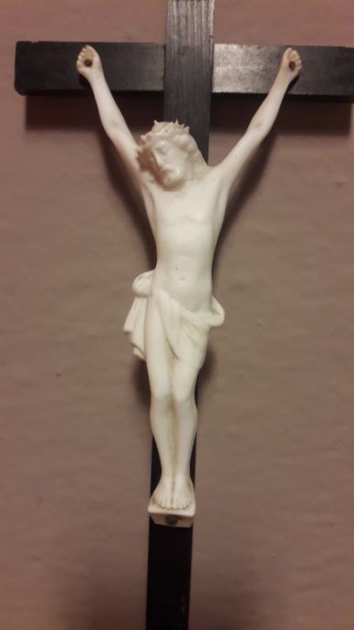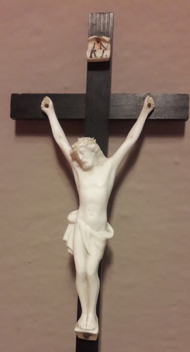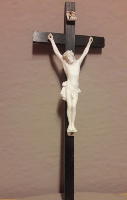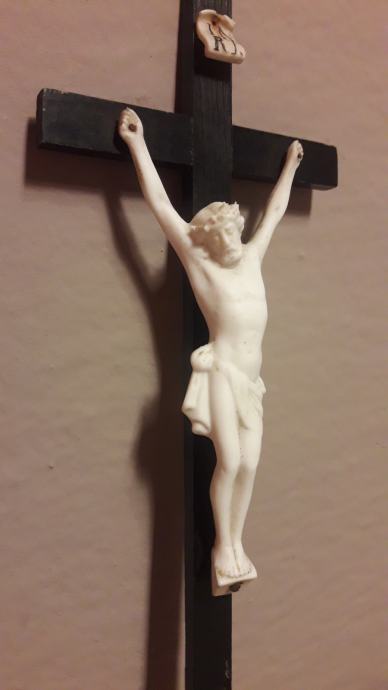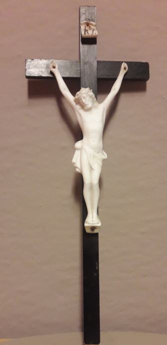 Isus i natpis izrađeni su od biskvitnog porculana. Dobro očuvano.